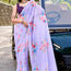 Elevate your festive look with this lavender crepe saree, featuring intricate floral prints and delicate pearls along the border. Its luxurious texture and graceful design make it a perfect choice for festive occasions and sophisticated casual gatherings.
