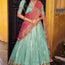 A stunning half-saree sky-blue lehenga set that beautifully blends traditional charm with festive elegance. The lehenga features a rich sea-green hue crafted in lustrous silk fabric, enhanced with a broad gold zari border that adds royal depth to the look.