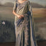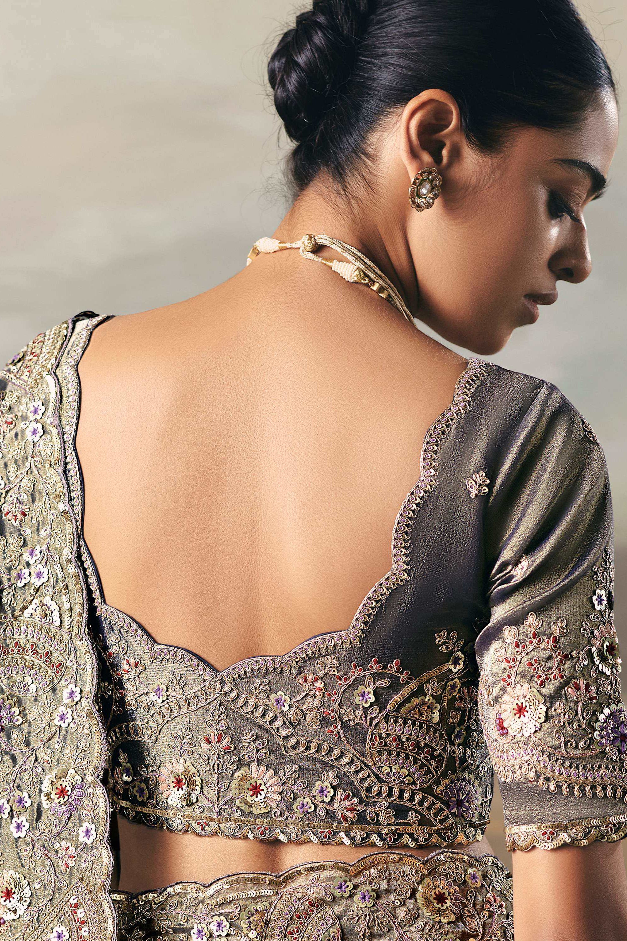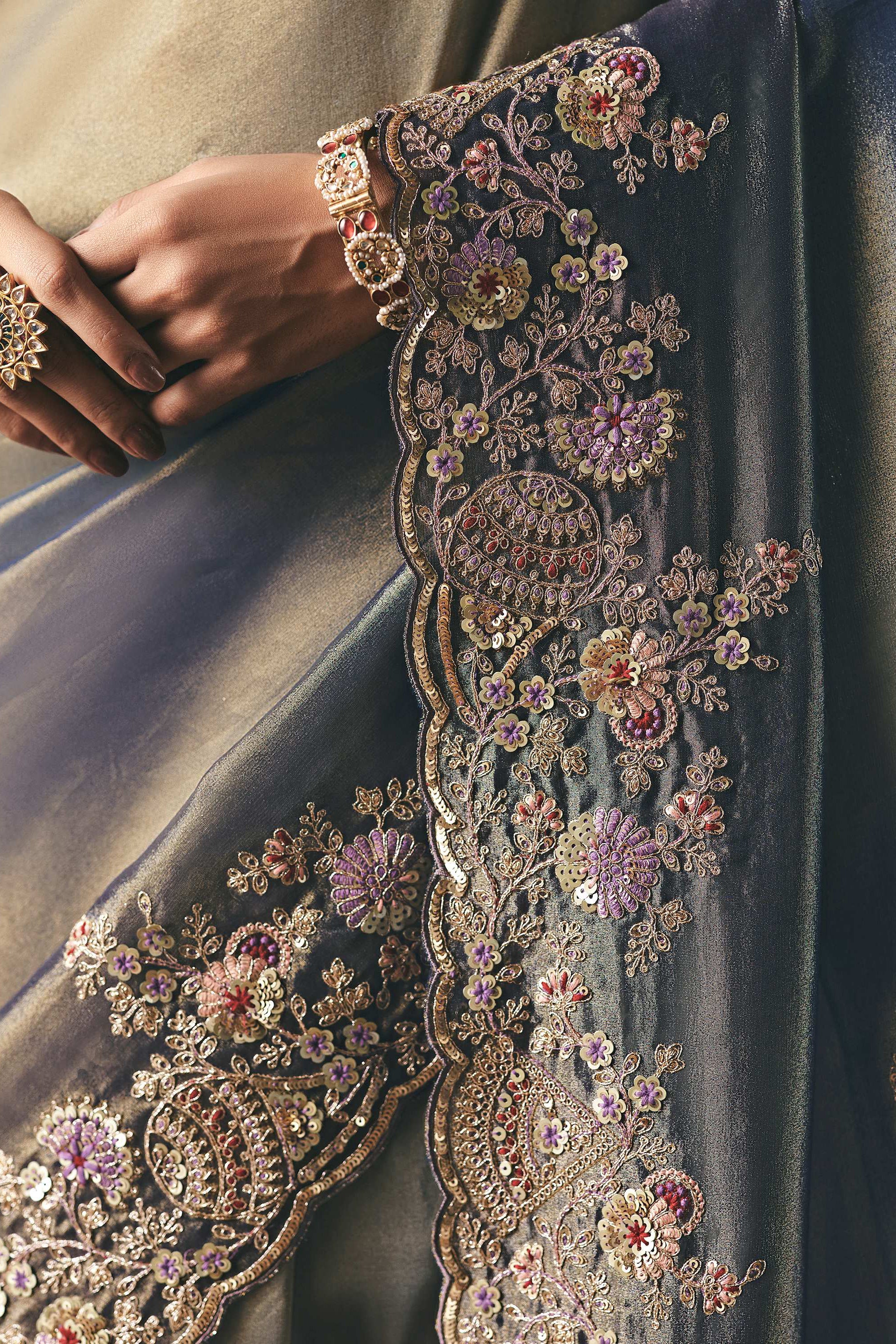 This stunning saree features a luxurious dual-tone drape in a blend of grey and deep navy hues, offering a sophisticated metallic sheen. The borders are richly adorned with intricate floral embroidery, sparkling sequins, and delicate threadwork in shades of lilac, gold, and pink — adding an exquisite grandeur. Scattered floral motifs throughout the saree create a subtle yet enchanting appeal, perfect for weddings and regal celebrations.