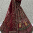 The maroon velvet lehenga features heavy embroidery with intricate floral, geometric, and architectural motifs, highlighted with sequins, stones, and zari work. The rich maroon velvet base adds depth and luxury, while multicolored thread embroidery in turquoise, pink, and gold enhances the regal look.