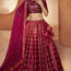 This stunning magenta velvet lehenga choli set radiates regal charm with its luxurious silk fabric, adorned with intricate mirror work and golden foil prints in symmetrical geometric patterns. The lehenga boasts a voluminous flair with a striking side bow detail that adds a playful yet sophisticated touch.
