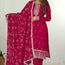 Behold the breathtaking beauty of this rani pink pure vichitra silk suit, a harmonious blend of traditional craftsmanship and contemporary design. The intricately detailed designer embroidery, sequence, and zari work, framed by a delicate fancy lace border, ensures a striking and glamorous presence at any event.