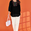 This outfit features a chic black georgette kurti designed with sheer full sleeves and a stylish high-low hemline. The neckline is accentuated with colorful mirror work embroidery in yellow, red, green, and white, bordered with red piping for a striking contrast. Paired with white bottoms, the look blends elegance with modern ethnic charm, perfect for casual and semi-formal wear.