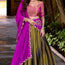 This lehenga choli set is crafted from luxurious Kanchipuram silk, featuring a stunning combination of olive-golden tones with a subtle shimmer. The lehenga is designed with graceful pleats and a rich magenta zari border that enhances its festive appeal.