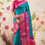 Pair this sky-blue tussar silk saree with a matching pink silk blouse, beautifully adorned with intricate zari weaving work. The vibrant pink hue adds a striking contrast, enhancing the saree’s elegance and ensuring you stand out at any wedding or festive occasion.