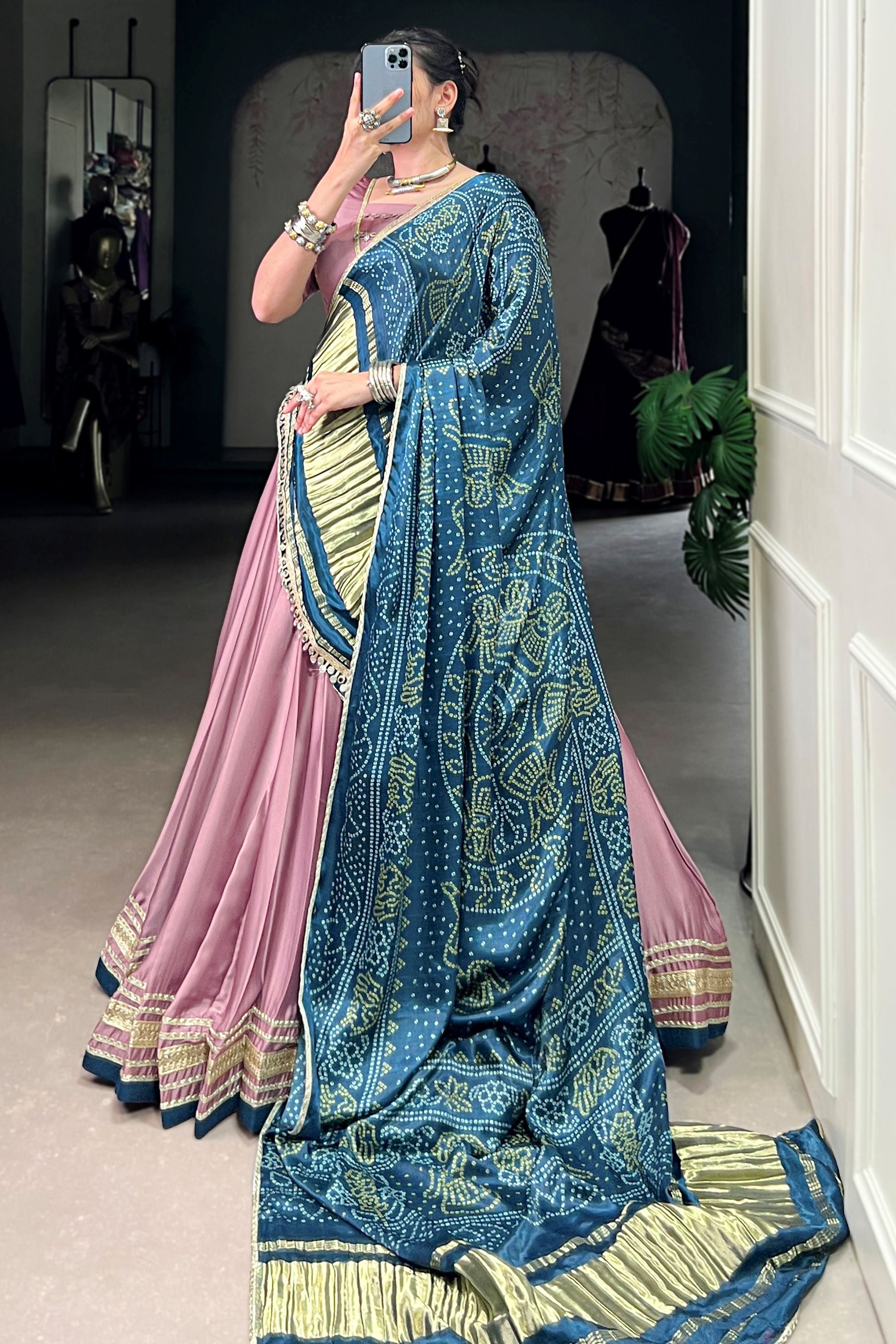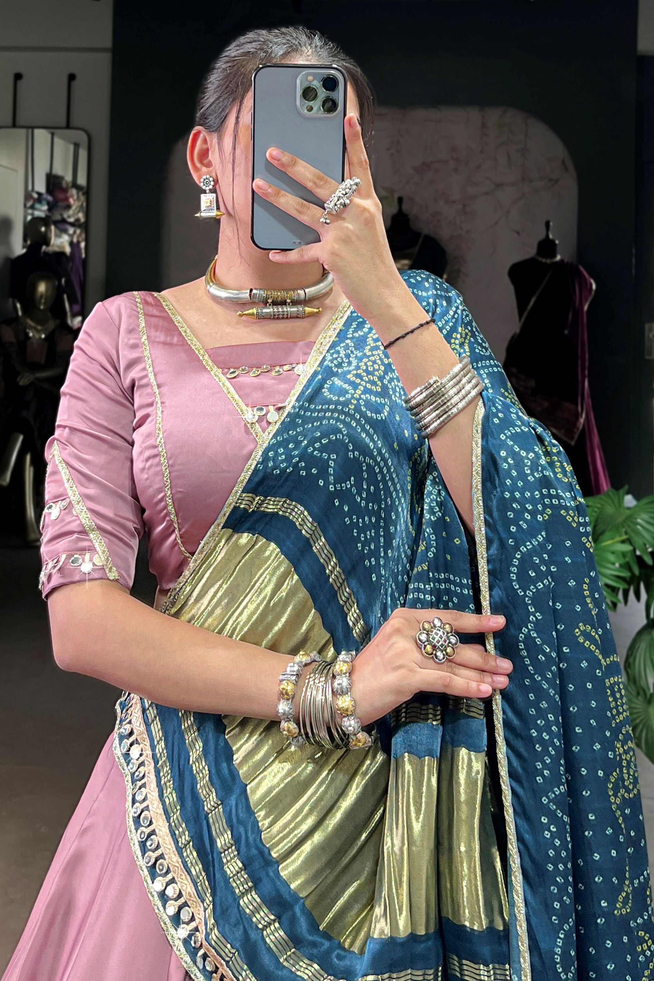Completing the set is a vibrant blue gaji silk dupatta, beautifully printed with classic Bandhani motifs and detailed with golden foil stripes and mirror-laced borders. This contrast color dupatta elevates the look with its richness and detail, making this ensemble ideal for festive functions, wedding ceremonies, or traditional celebrations.