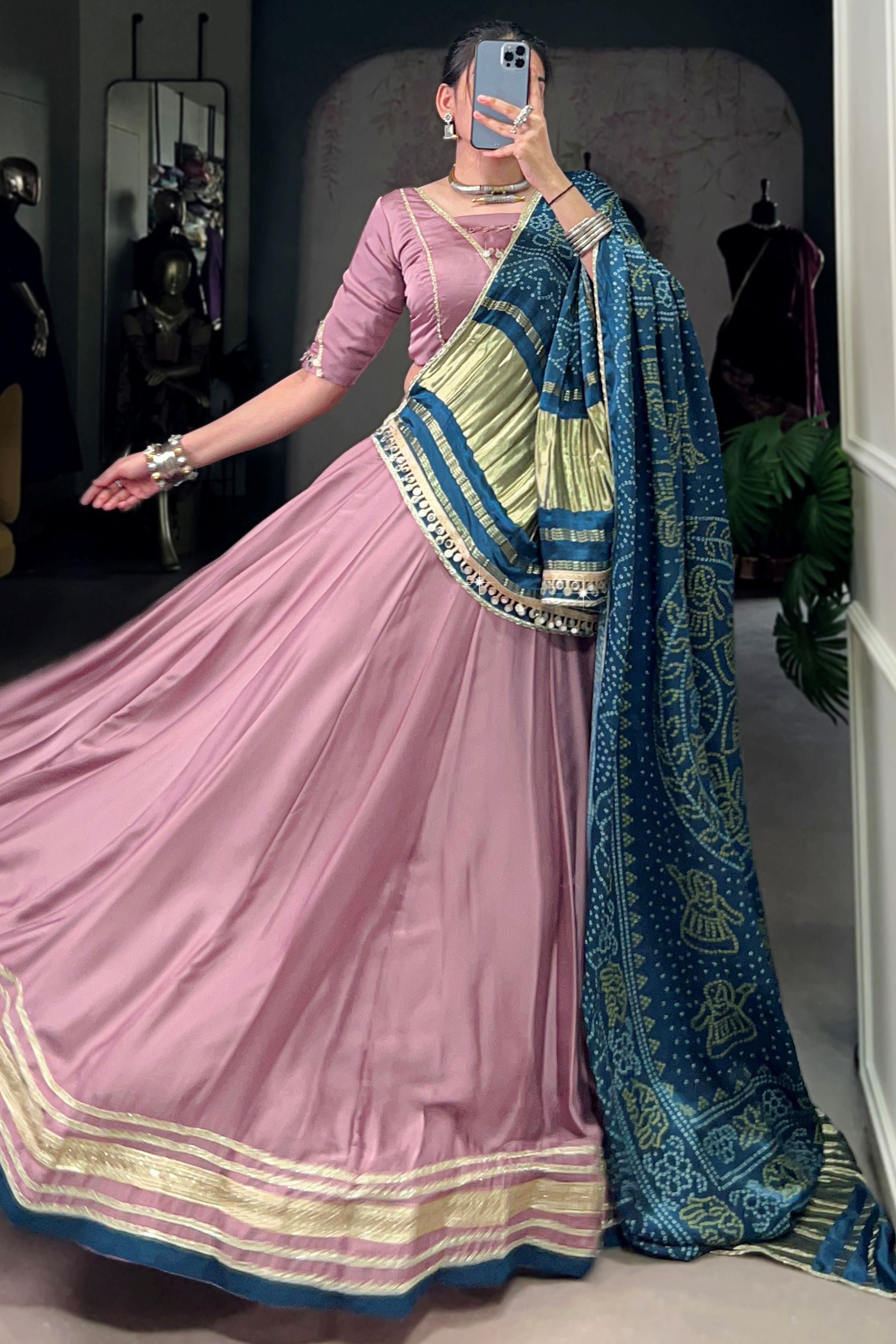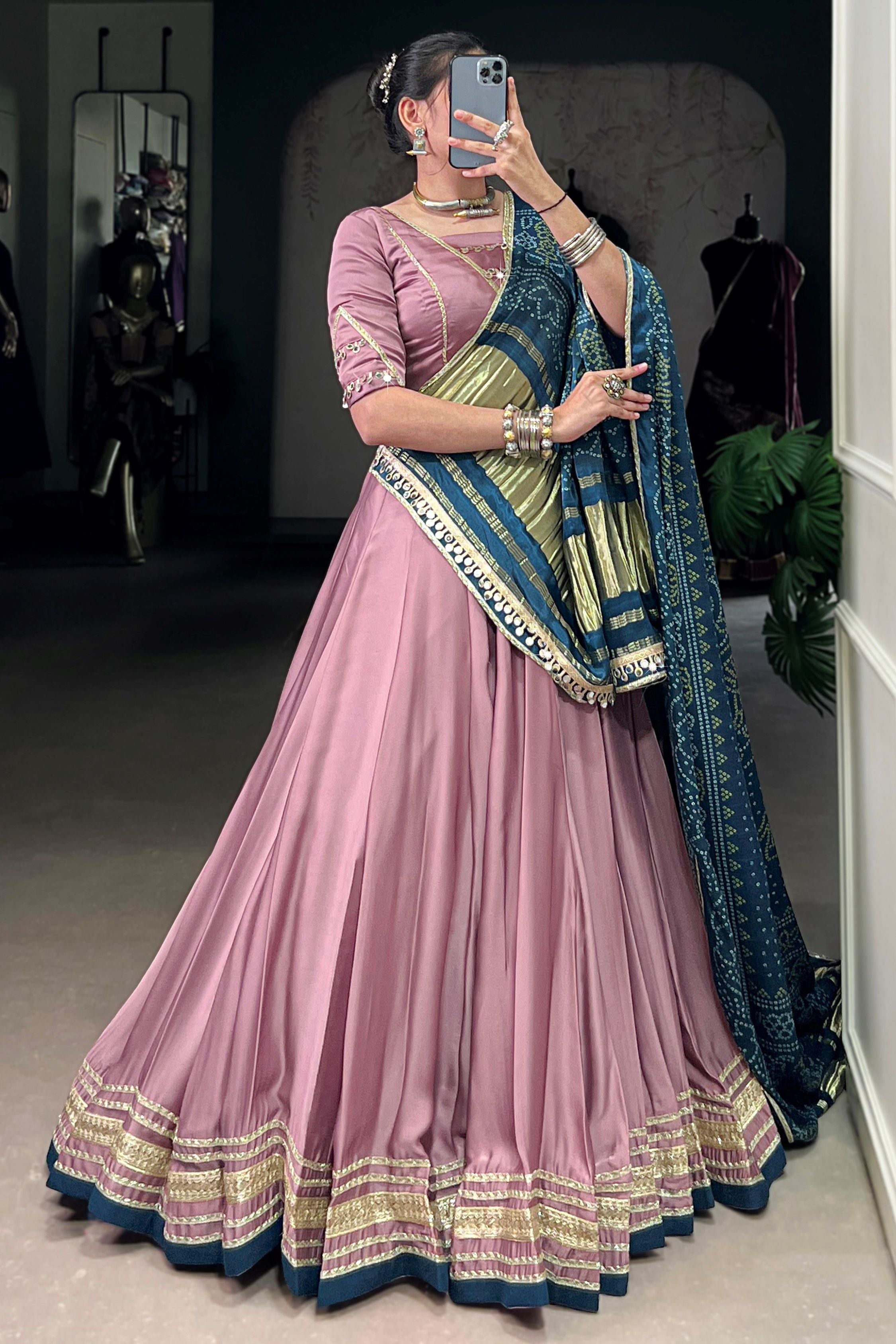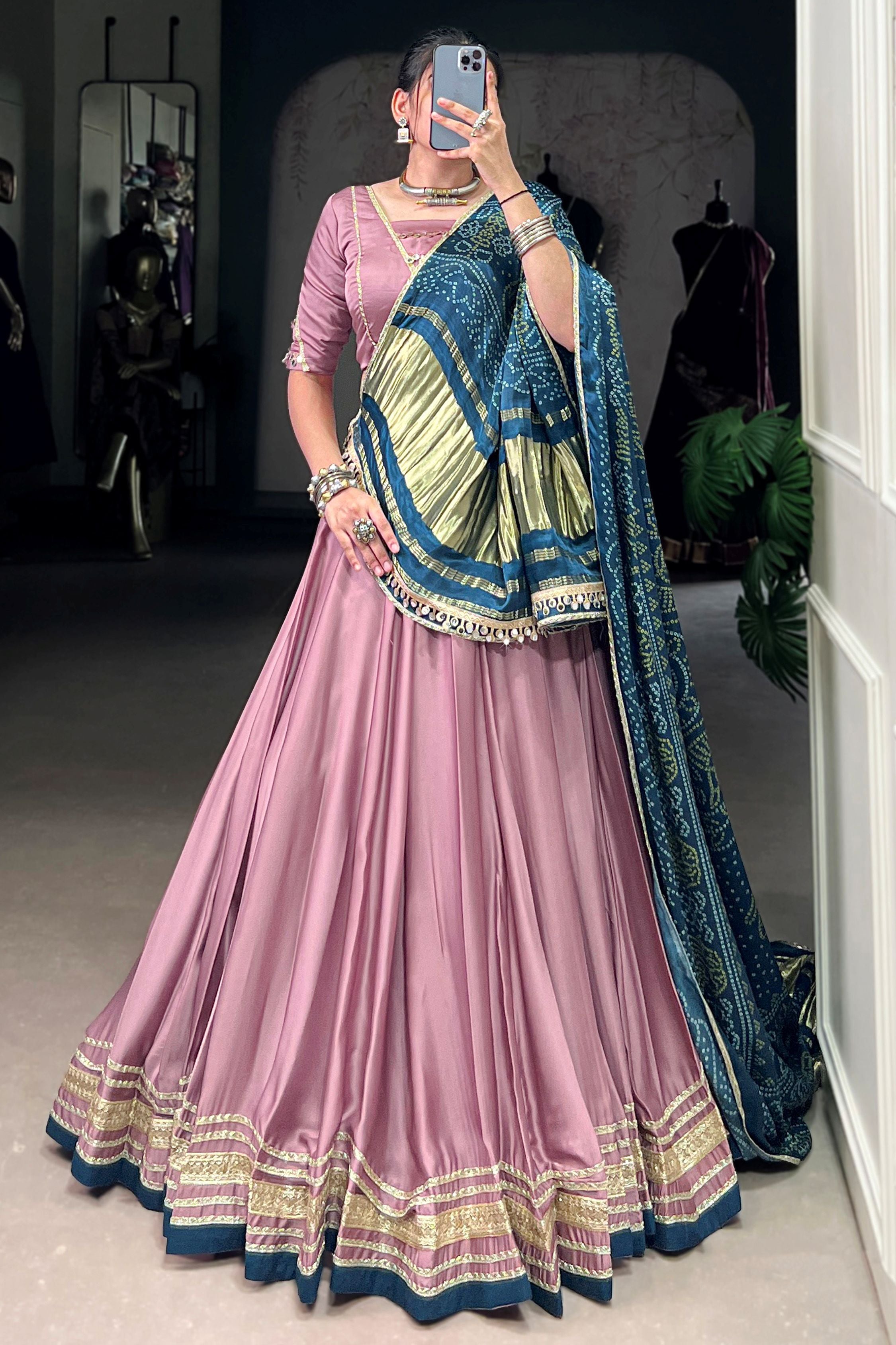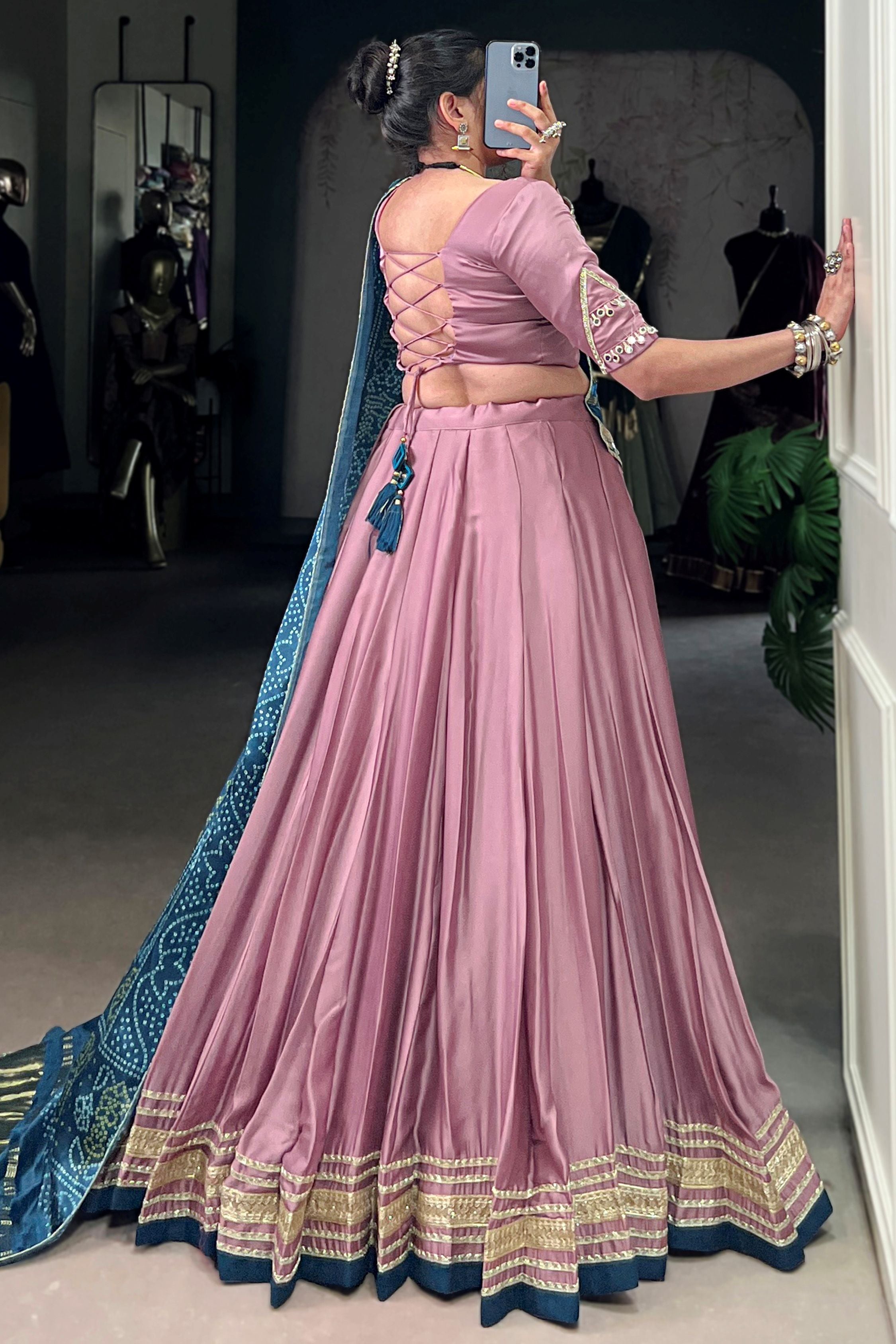 This beautiful georgette lehenga choli set features a sophisticated mauve pink hue that brings elegance and softness to the ensemble. The lehenga is crafted from flowing fabric with a rich flare, accentuated with golden zari lace and deep blue piping at the hem for a regal finish.