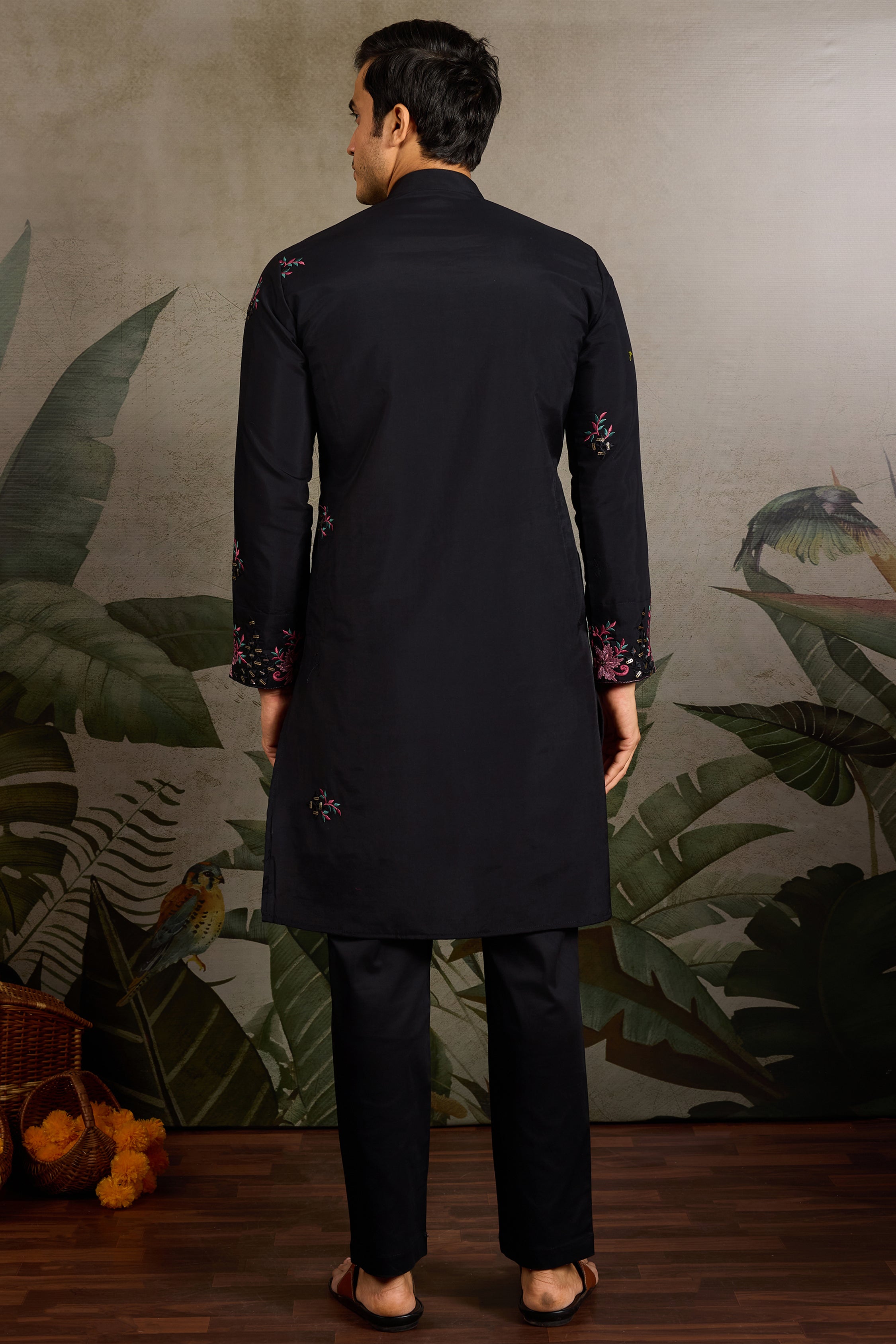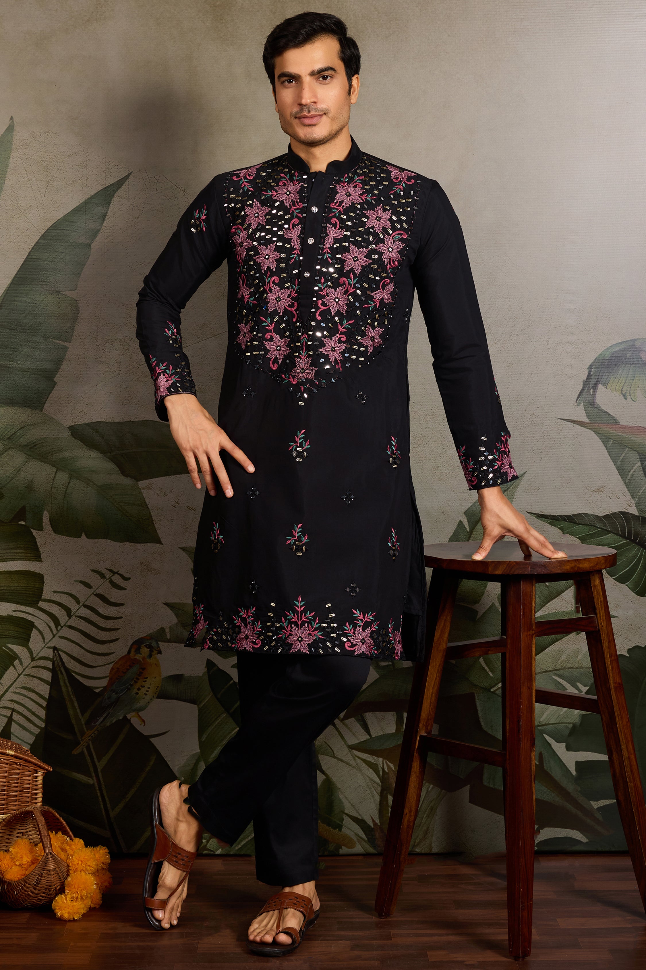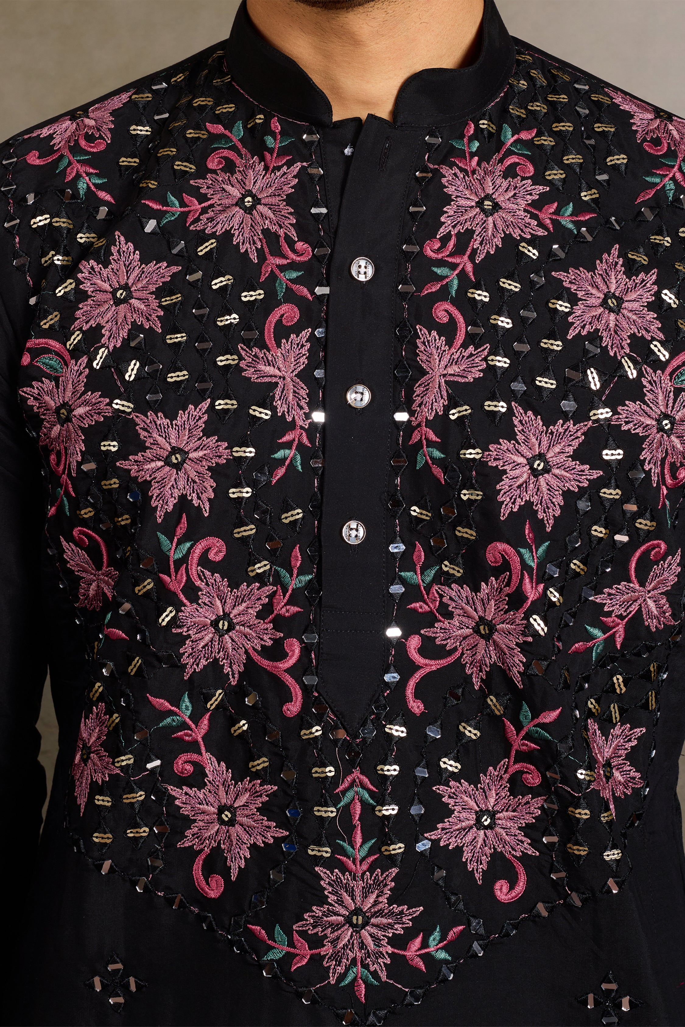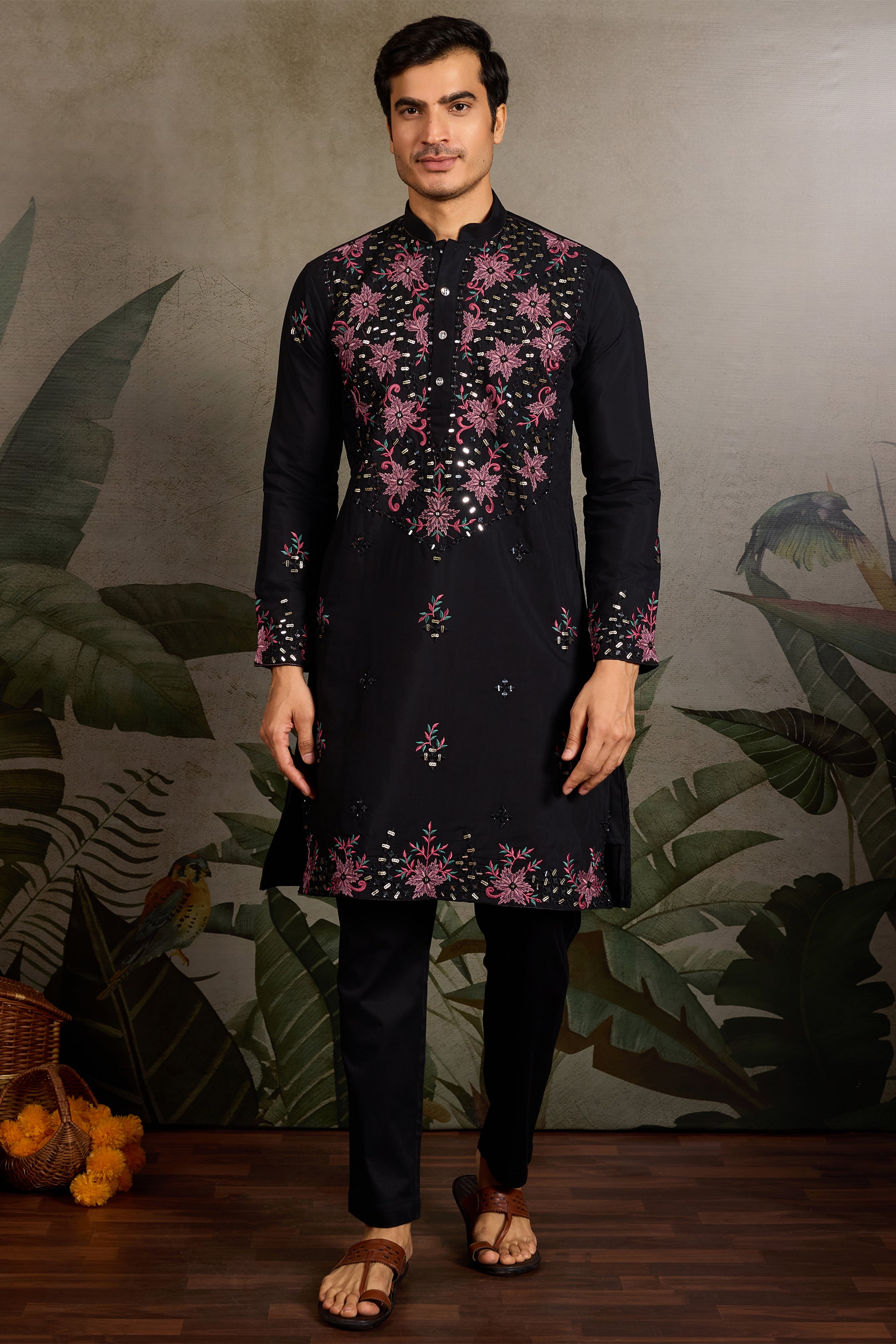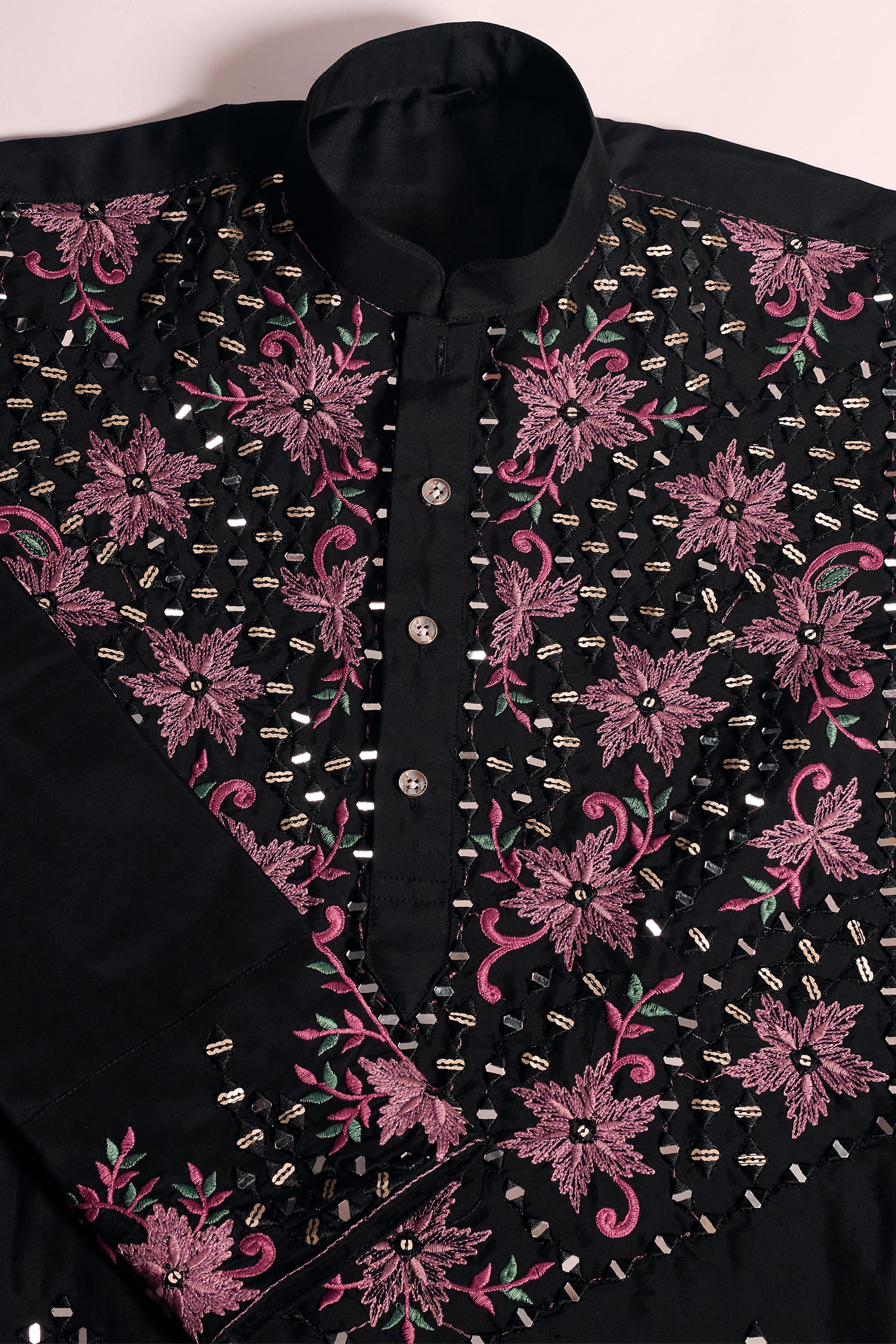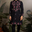 A striking black embroidered kurta set featuring rich pink floral threadwork and shimmering mirror embellishments across the yoke, sleeves, and hem. The detailed craftsmanship creates a bold yet elegant festive look, complemented by subtle scattered motifs throughout the fabric.