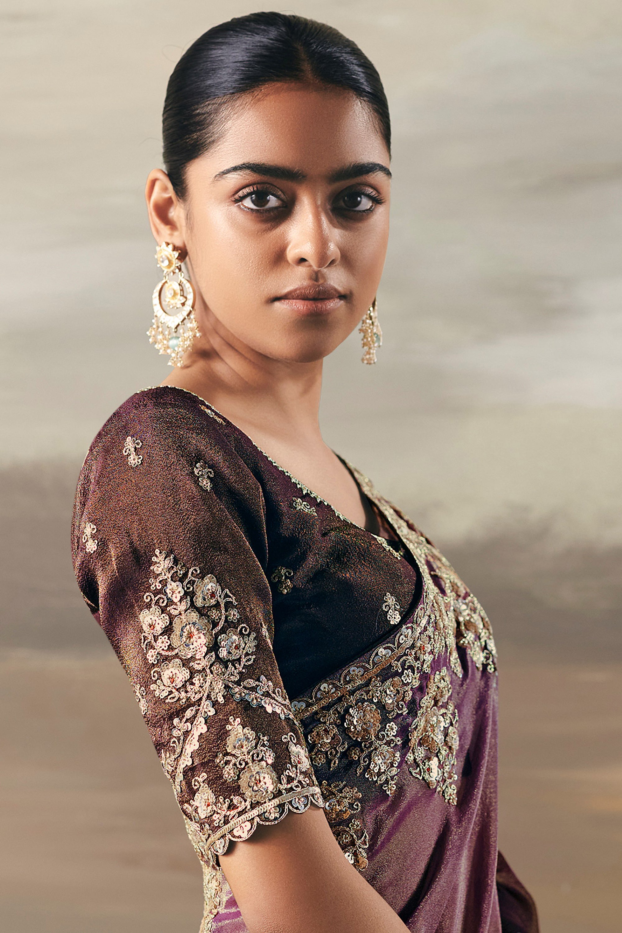 This luxurious saree features an exquisite blend of rich plum and deep brown tones, designed to create a regal ombre effect. The entire drape is adorned with intricate floral embroidery in shimmering golden zari and sequence work, especially highlighted along the elaborate border and pallu. Perfect for grand celebrations, weddings, or evening functions — this saree brings an aura of sophistication and timeless elegance.