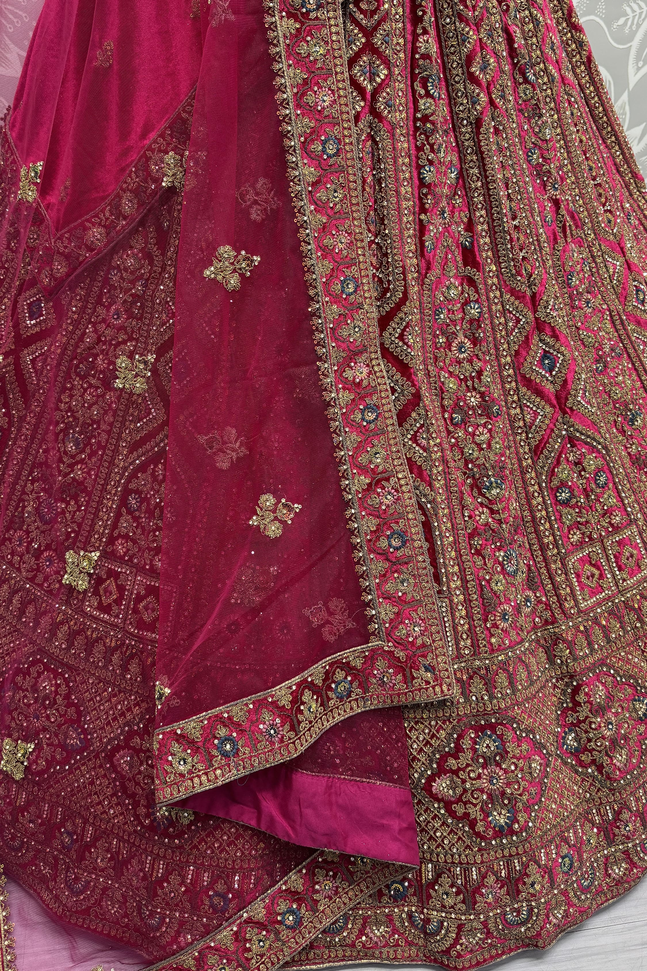 Complete your look with two dupattas one in velvet featuring butta work and lace borders, and the other in net with intricate embellishments. These layers add volume, sophistication, and a majestic finish to your wedding attire.
