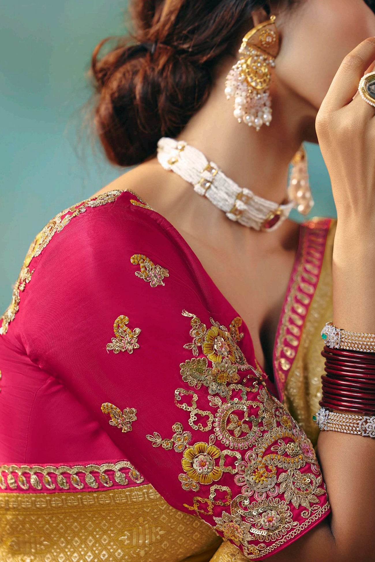 This saree design is a radiant combination of mustard yellow and pink, creating a bold and festive appeal. The mustard yellow saree is adorned with delicate golden woven motifs, enhanced by a finely detailed zari border that adds an elegant shimmer to the drape.