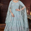 Elevate your wardrobe with our breathtaking sky-blue gown, available in ready-to-wear sizes 38 and 42. Designed to perfection, this exquisite piece features intricate thread embroidery and jarkan embellishments with mirror accents, ensuring you captivate attention at any event. With a graceful length of 57 inches, the gown flows elegantly, creating a stunning silhouette that is sure to turn heads.