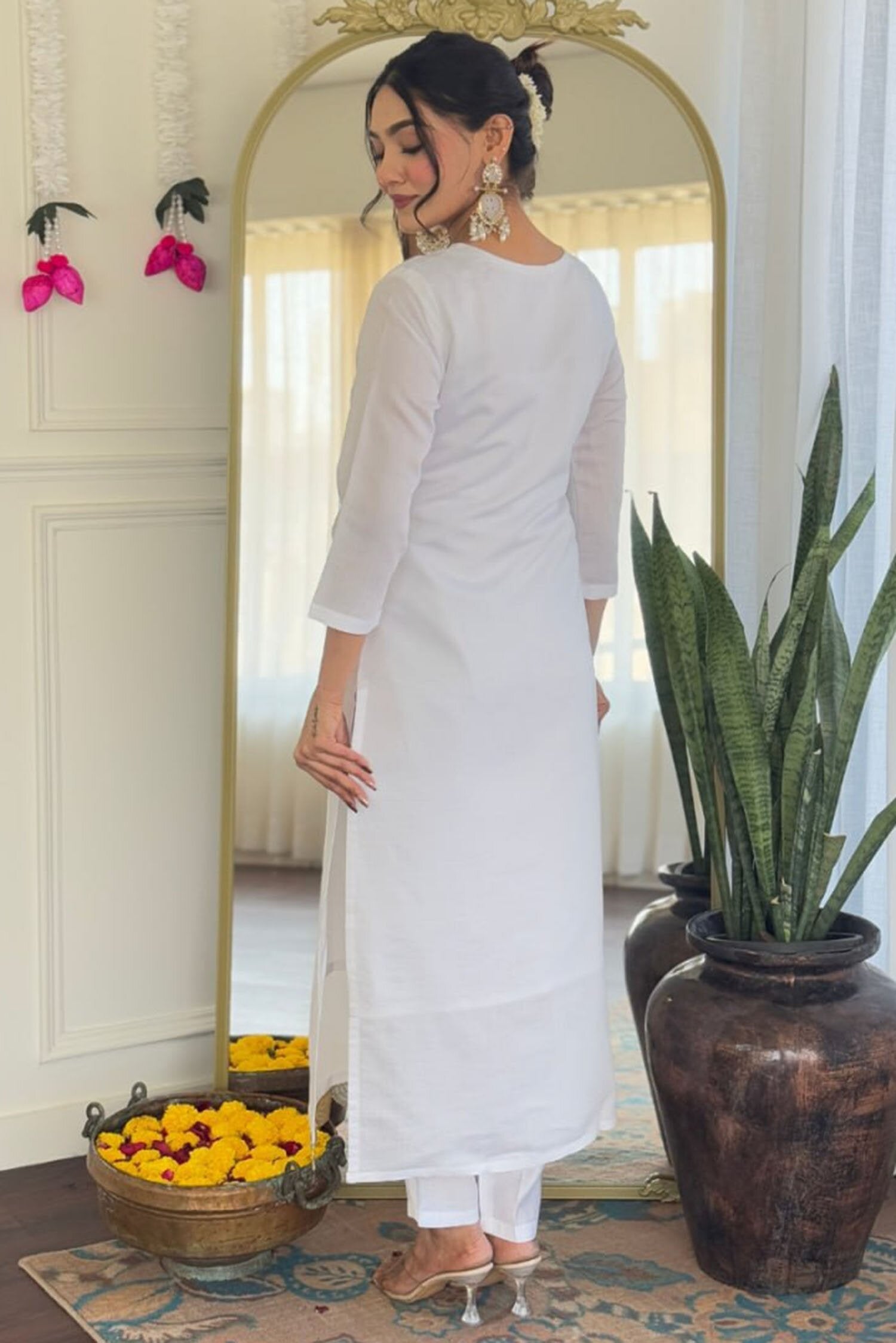 The set includes matching off-white viscose pants tailored for comfort and a flattering fit. This graceful combination ensures you move with ease while maintaining a polished and sophisticated look.