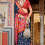 Paired with a vibrant red silk blouse featuring complementary print work, this ensemble is perfect for making a statement at any festival. The rich colors and intricate details ensure you stand out with grace and confidence, making it an ideal choice for your special occasions.
