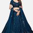 The flared lehenga is beautifully adorned with mirror work and delicate thread embroidery, arranged in scattered patterns across the body. The hemline stands out with a striking border of floral embroidery in shades of red and pink, giving the outfit a vibrant contrast against the dark blue base.