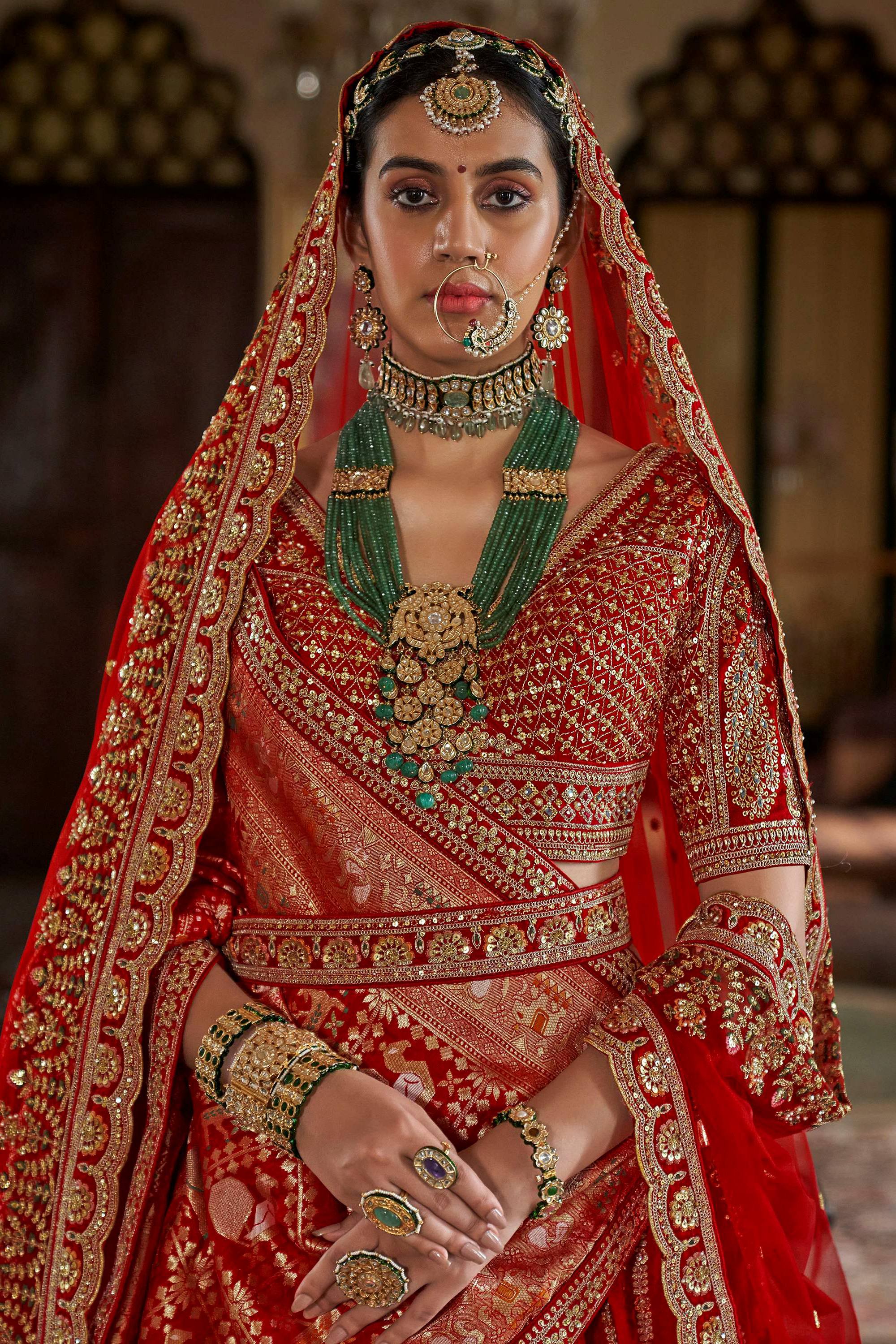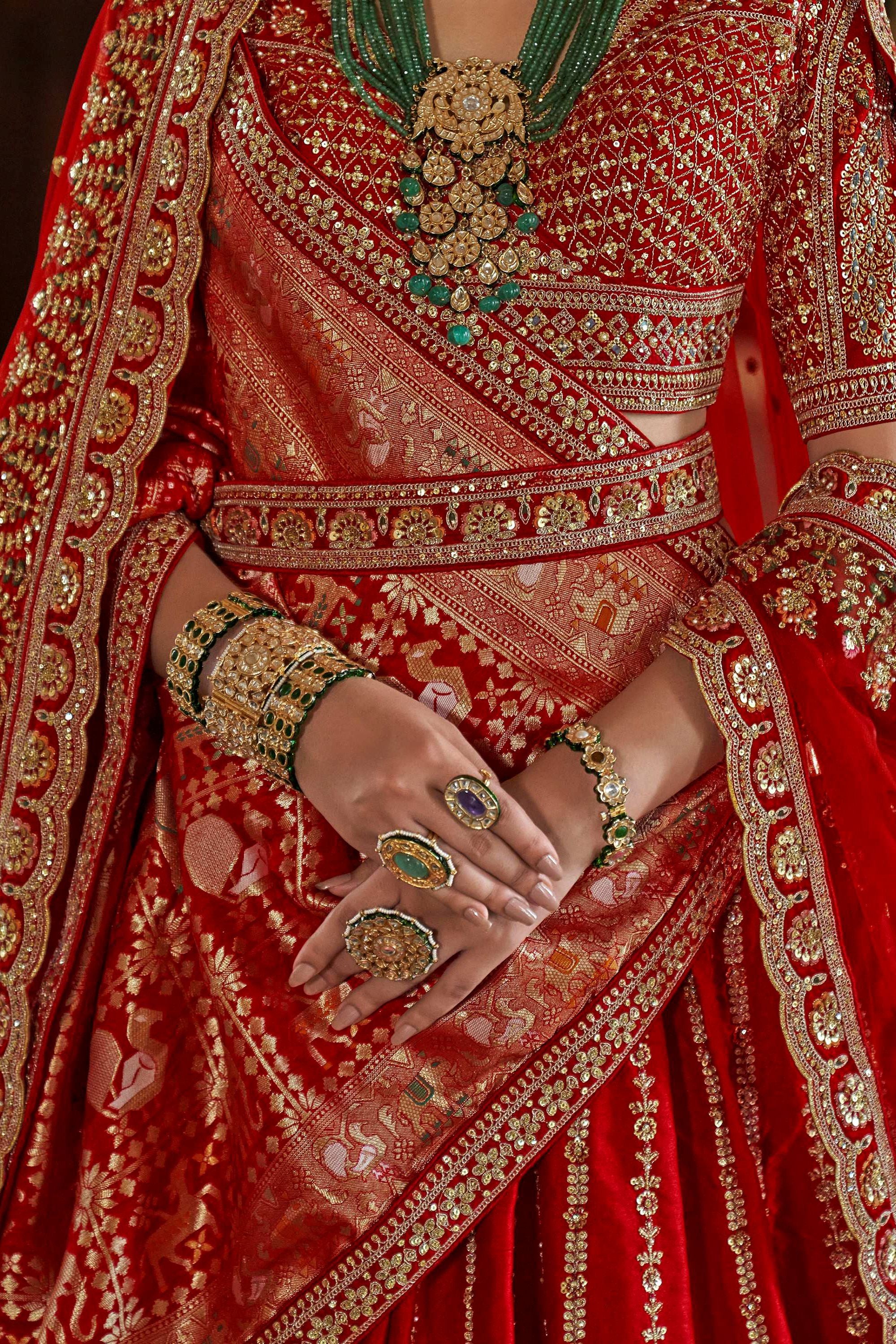 The look is completed with two dupattas — one crafted in net and another in Banarasi weaving — both adorned with sequins and thread embroidery. The layering of rich textures and intricate borders enhances the overall bridal elegance, creating a perfect ensemble for a queenly wedding day appearance.