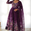 The outfit is elegantly completed with a matching purple organza dupatta, featuring lovely floral print work that complements the Anarkali suit perfectly.