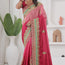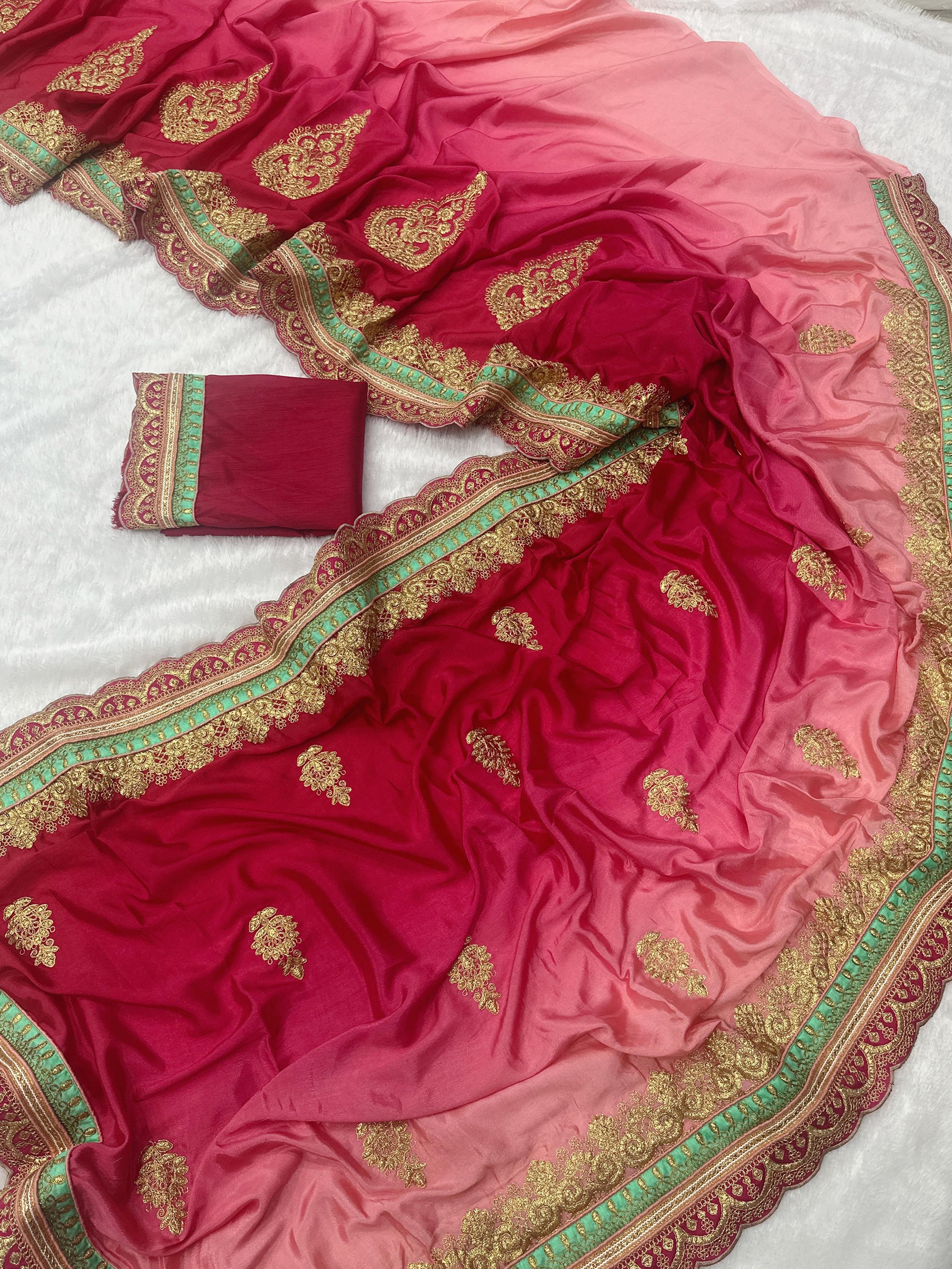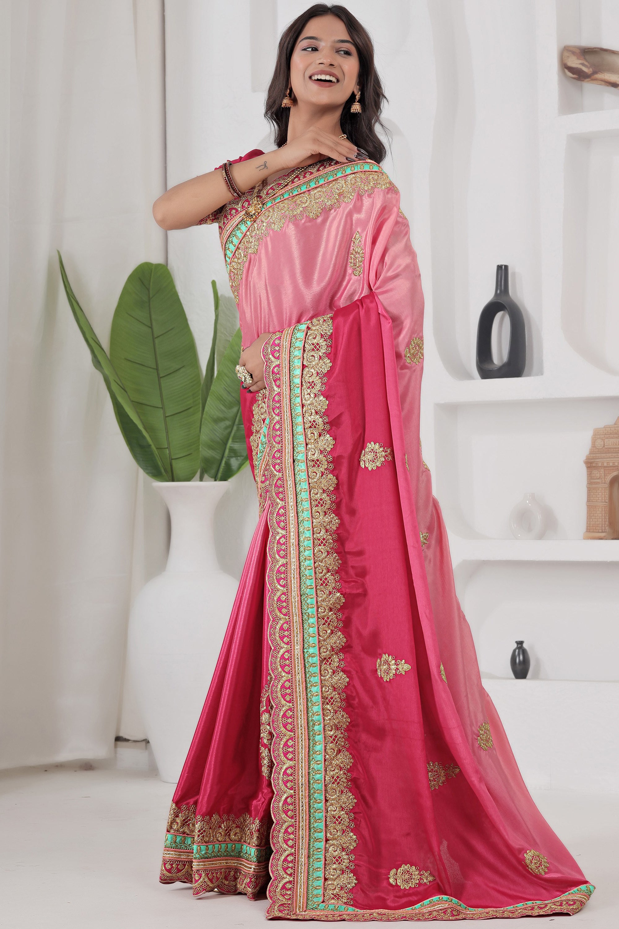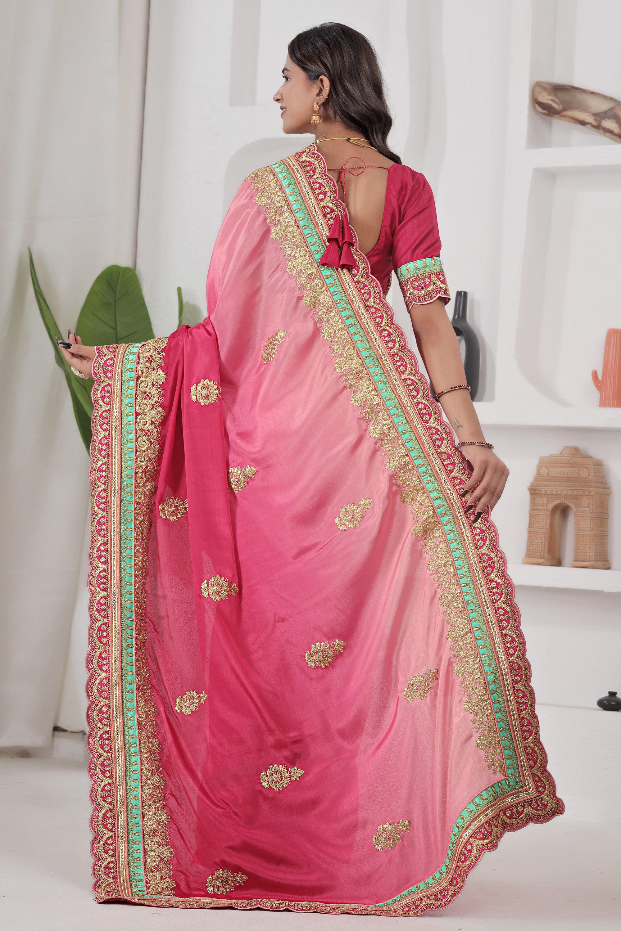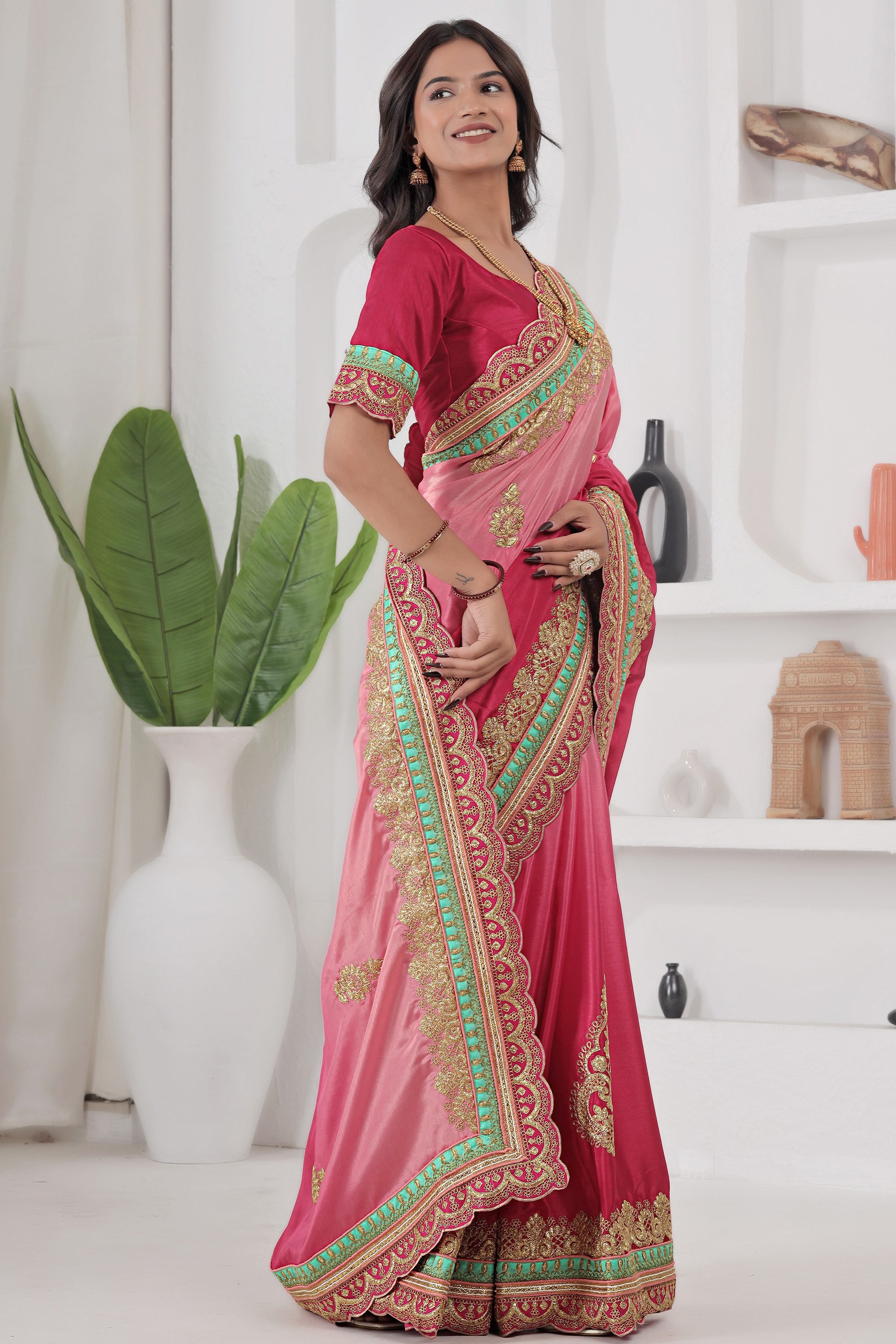 This stunning saree comes in a rich combination of bright pink and deep magenta, elevated with heavy golden zari embroidered motifs throughout the drape. The border stands out beautifully with scalloped edges featuring contrasting turquoise detailing and intricate floral embroidery, adding a regal and festive charm.