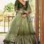 Make a statement at your upcoming events and festivals with this exquisite green chinon lehenga, featuring intricate thread embroidery and sparkling sequin work. Perfect for achieving a stunning ethnic look, this lehenga will add elegance and charm to any special occasion.
