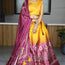 Brighten your festive wardrobe with this yellow art silk lehenga, adorned with intricate printed designs and gota patti work on the kali. Its vibrant hue and elegant details make it a perfect choice for any celebration, blending tradition with modern style.