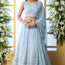 The lehenga is crafted in a soft, pastel sky-blue color, creating an ethereal and graceful look. It is fully adorned with intricate white and silver thread embroidery, forming delicate floral vines, geometric patterns, and traditional motifs like paisleys and lattice designs.