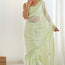 Complementing the saree is a matching pista green silk blouse, adorned with similar sequins and thread embroidery that adds richness to the ensemble. The luxurious silk texture beautifully balances the lightweight saree, offering a refined and graceful appeal that’s ideal for women who appreciate understated glamour.