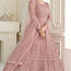 This elegant baby pink net anarkali gown exudes grace with its intricate tone-on-tone thread embroidery and delicate sequin highlights, creating a luxurious yet subtle shimmer. The flared silhouette is richly decorated with ornate floral and vine patterns, making it perfect for weddings, receptions, and grand festive occasions.