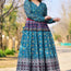 A stunning Chanderi silk Anarkali-style gown, designed with a fusion of traditional prints and modern elegance. The gown features intricate geometric and floral motifs in shades of blue, teal, and red, creating a visually rich appearance. The flare of the outfit adds volume and grace, making it perfect for festive and celebratory occasions. The front highlights a V-neckline with full sleeves, exuding sophistication.