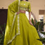 Step into timeless elegance with this olive-green georgette lehenga, richly adorned with pearl, sequins, and zari embroidery. With a grand 5-meter flair and stitched canvas with cancan, this semi-stitched lehenga offers a regal and flowing silhouette, perfect for weddings and festive occasions.
