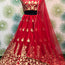 This net lehenga set is a stunning red ensemble crafted with a sheer net base richly adorned in golden floral embroidery. The lehenga features dense embroidery along the hemline, creating a royal finish, while the upper section showcases scattered but elegant motifs that add depth and balance to the design.