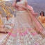 The flared net lehenga features a captivating geometric diamond pattern in shades of gold, pink, orange, and yellow, highlighted with reflective mirror work for a shimmering effect. The arrangement of colors creates a beautiful ombré gradient from the hem upward, making the ensemble visually dynamic and festive.