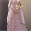 The lilac net lehenga’s base is adorned with delicate floral patterns, while the wide hemline is heavily decorated with a unique geometric sequin design for added grandeur. The soft net dupatta complements the ensemble with scattered floral motifs and an ornate triangular sequin lace border.