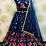 The navy-blue net lehenga features a rich spread of golden and pink floral embroidery towards the hem, which adds a stunning contrast and brings a vibrant charm to the dark base. The golden embroidered border at the hemline further enhances the grandeur of the outfit, making it perfect for festive and wedding occasions.