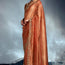 This saree is crafted in luxurious organza fabric, radiating a rich copper-orange tone that exudes elegance. The saree features delicate floral embroidery with golden zari and sequins, creating a regal and timeless look. The border is intricately embellished, adding a striking highlight to the soft shimmer of the organza fabric.