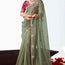 The green organza saree is designed in a soft, sheer fabric, embellished with delicate floral embroidery and sequin along the borders and scattered motifs throughout the drape. The muted olive tone is elegant and understated, while the subtle shimmer of the embroidery adds a graceful charm.