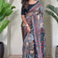 Embrace cultural elegance with this blue viscose saree, adorned with intricate pichwai prints featuring cow figures and lotus motifs. Highlighted by a premium zari patta border, digital prints, and tassel detailing, it’s perfect for festive and traditional celebrations.
