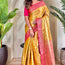 Celebrate tradition in style with this yellow tissue silk saree, perfect for haldi ceremonies and festive occasions. Featuring intricate zari weaving and delicate meena work, it reflects timeless elegance and joyful vibrance.