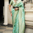 Make a stunning statement at your upcoming events with the polly viscose silk aqua-green saree, a beautiful fusion of sophistication and vibrant artistry. Featuring an exquisite Banarasi pattern, this saree effortlessly transforms traditional wear into a modern style statement, perfect for those who appreciate intricate craftsmanship.