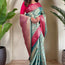 Step into the spotlight this festive season with a mesmerizing teal blue tissue silk saree, an embodiment of traditional charm and celebratory spirit. The saree boasts intricate zari weaving and delicate meena work, exuding timeless elegance perfect for weddings and special occasions.