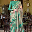 Accompanying the saree is a matching unstitched sea green blouse, crafted from the same luxurious Banarasi silk and embellished with refined zari details. Tailored to perfection, the blouse can be customized up to 42 inches, allowing for a flawless fit that celebrates all body types while enhancing the overall allure of your ensemble.
