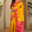 Perfect for haldi celebrations, this yellow paithani silk saree is adorned with intricate contrast weaving on the pallu and border, reflecting the richness of Indian craftsmanship. Its bright hue and artistic detailing make it a standout choice for weddings and festive occasions.