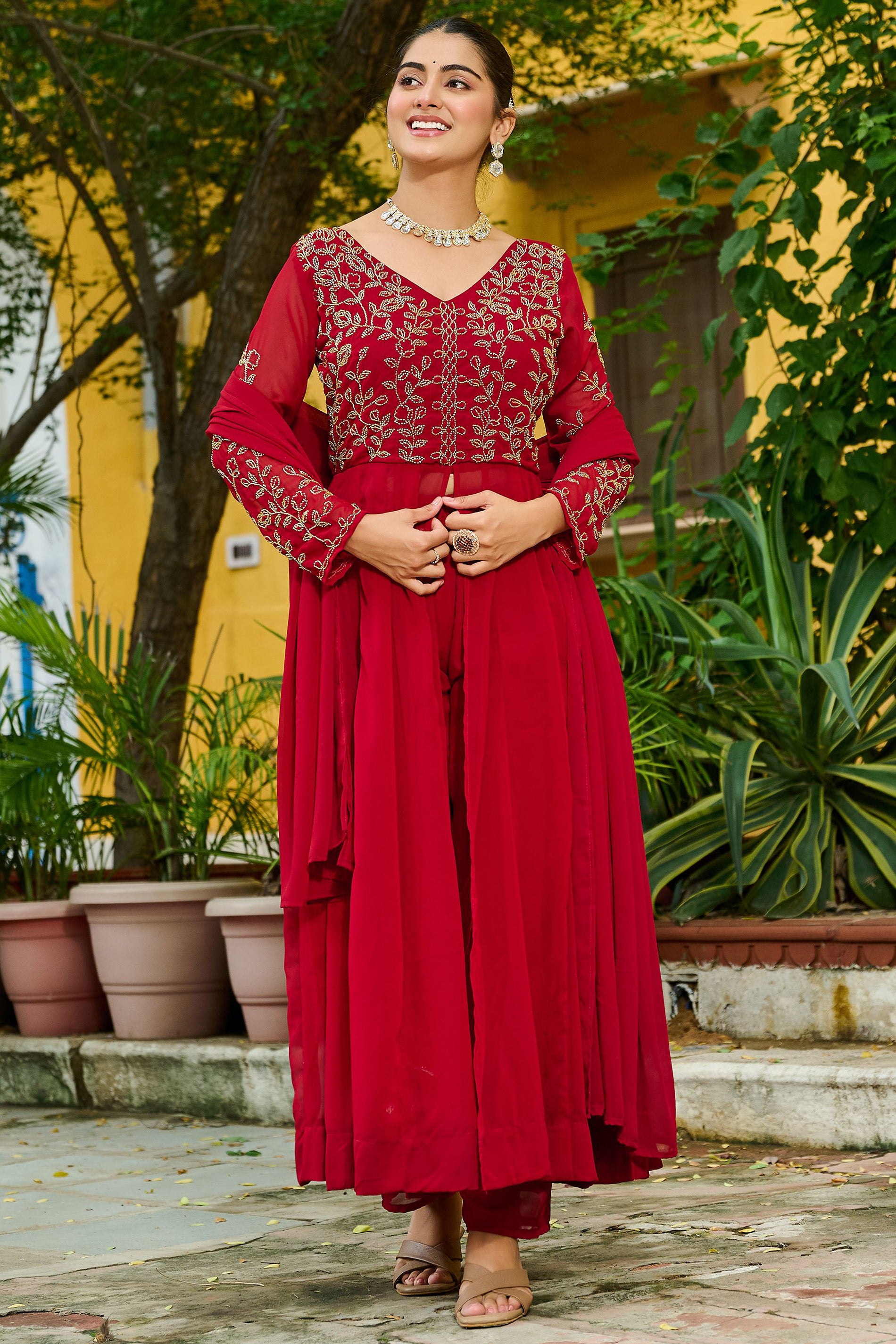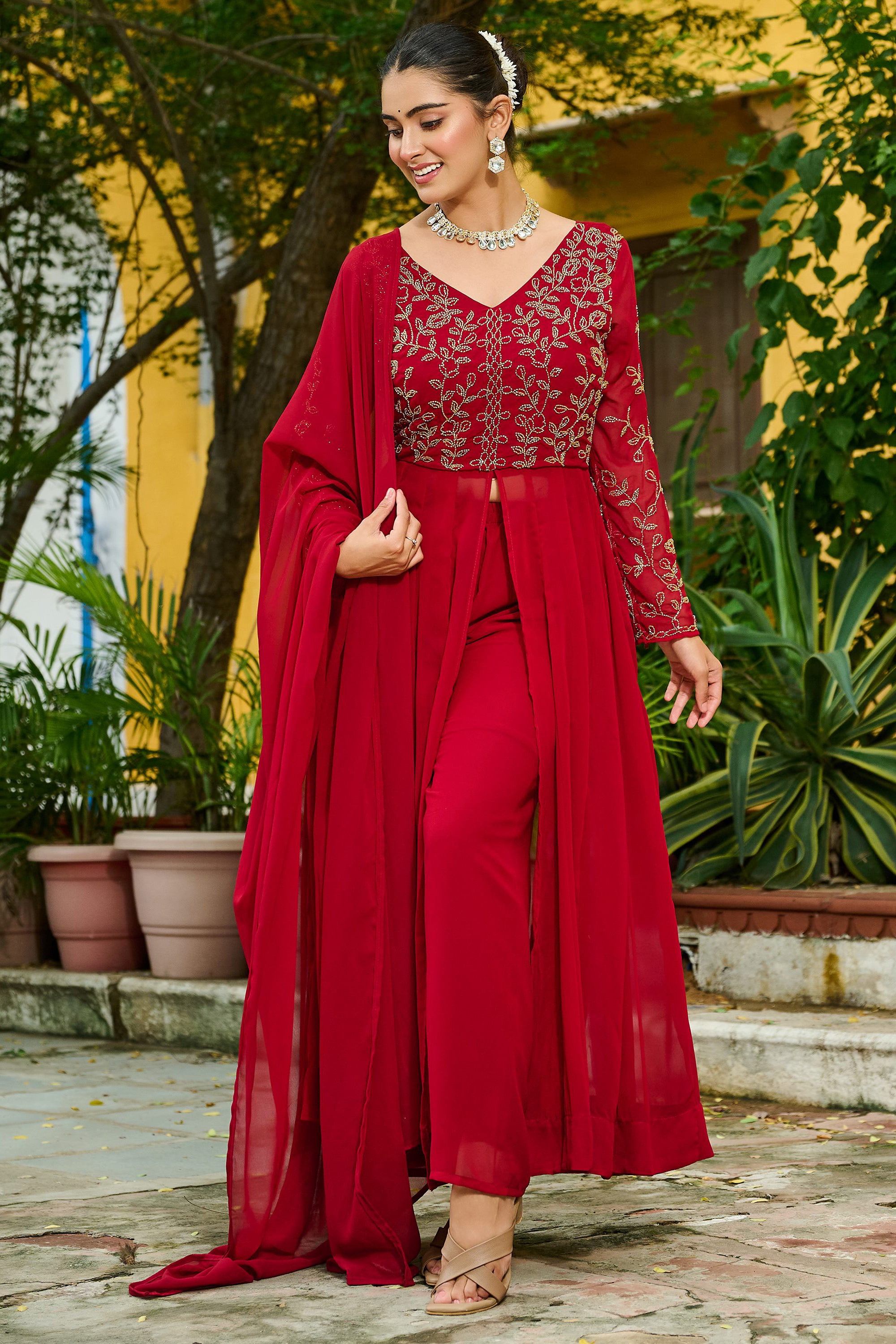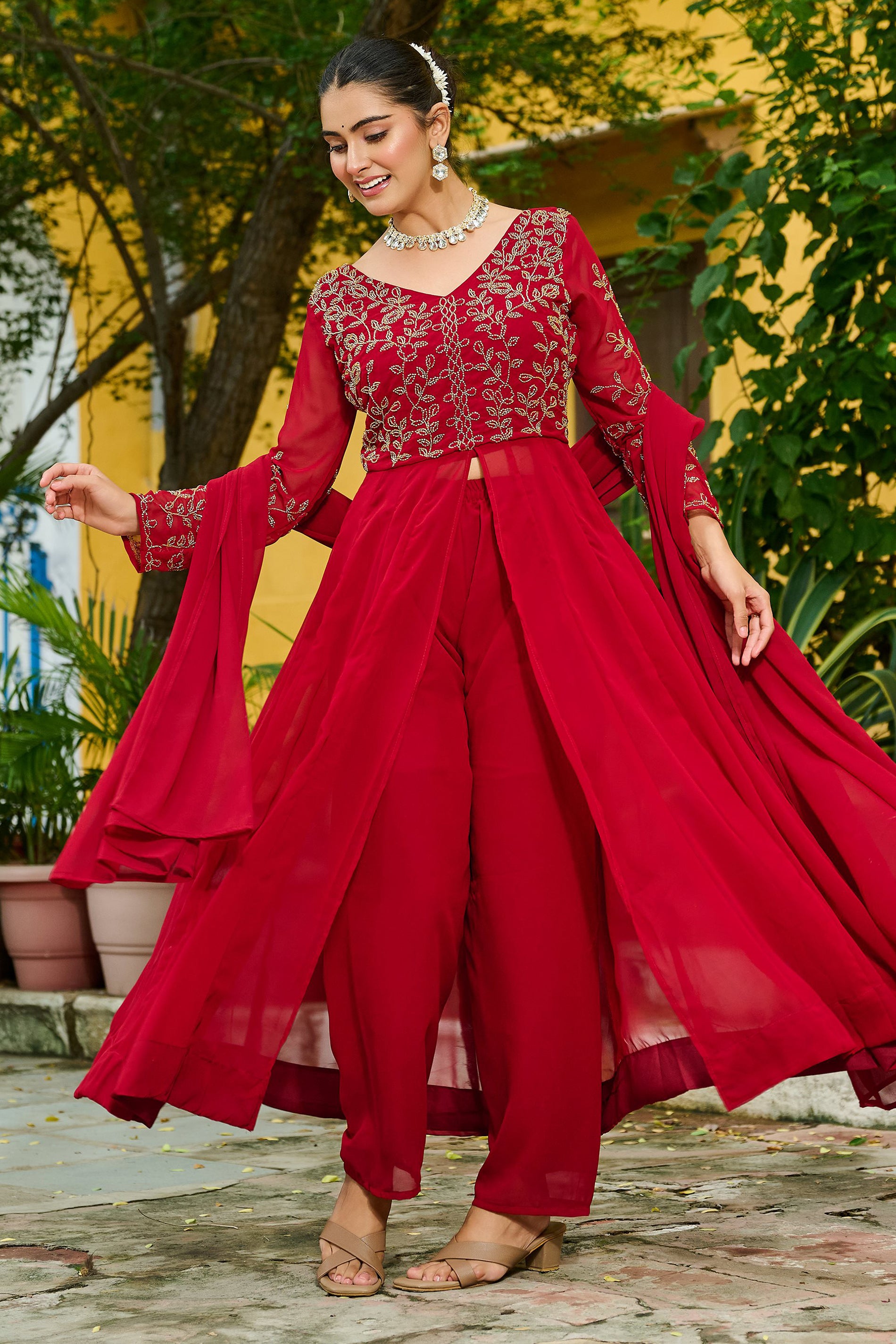The bottom comes in a matching red tone, designed in a straight-cut style for comfort and modern appeal. It pairs seamlessly with the flared upper design, creating a balanced and stylish ethnic look suitable for festive and formal events.