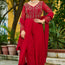 The suit features a rich red kurti beautifully highlighted with intricate golden embroidery on the bodice and sleeves. The V-neckline adds a graceful touch, while the sheer long sleeves bring a blend of elegance and charm to the overall design. The flowy silhouette of the top ensures perfect movement and a flattering fall.
