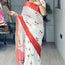 The vibrant white blouse and matching borders with intricate woven patterns add a rich contrast, enhancing its festive look. Its combination of artistry, symbolism, and traditional aesthetics makes it an ideal choice for puja rituals, festive gatherings, and cultural occasions.