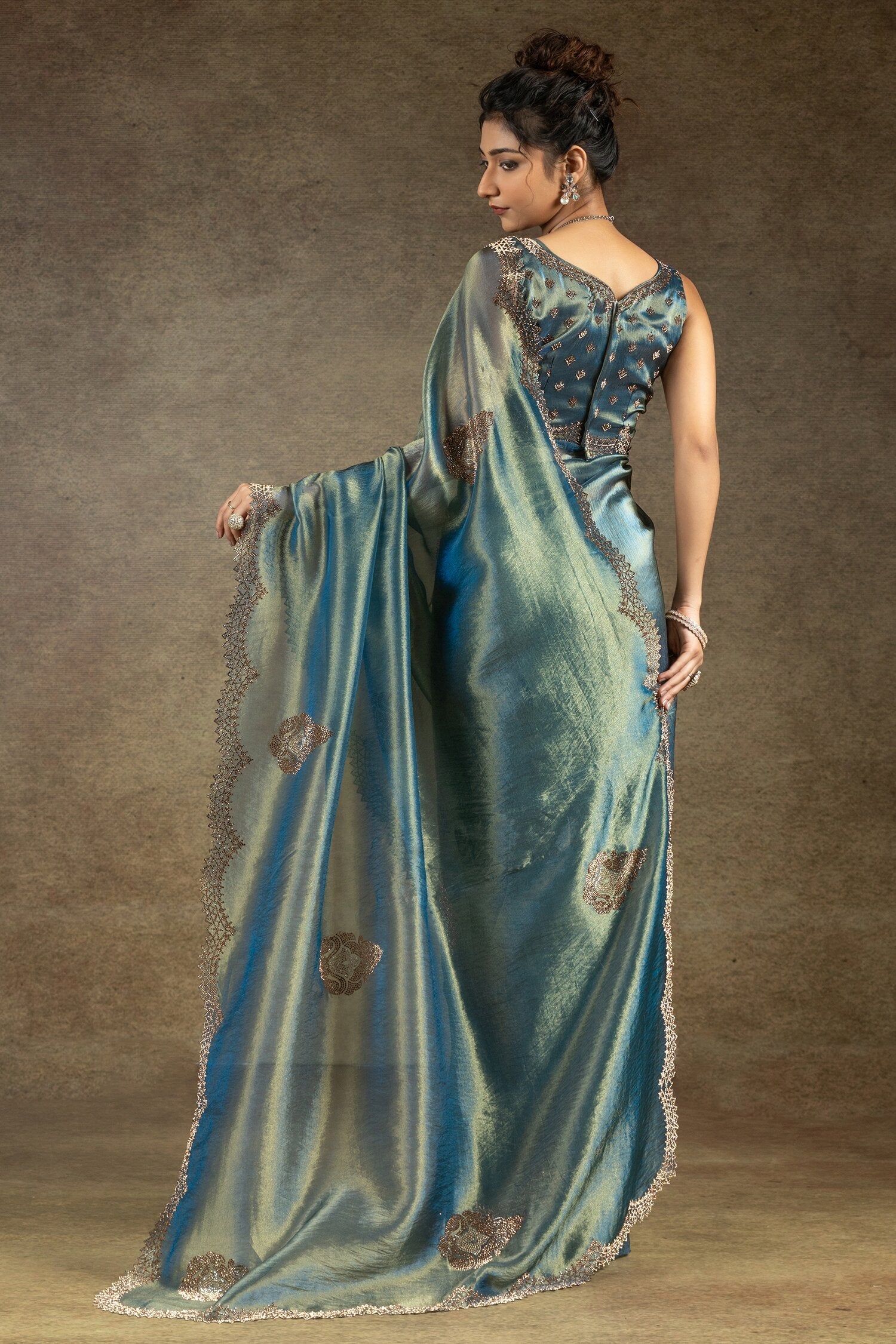 Alluring Dusty Green Hand Work Organza Function Wear Saree