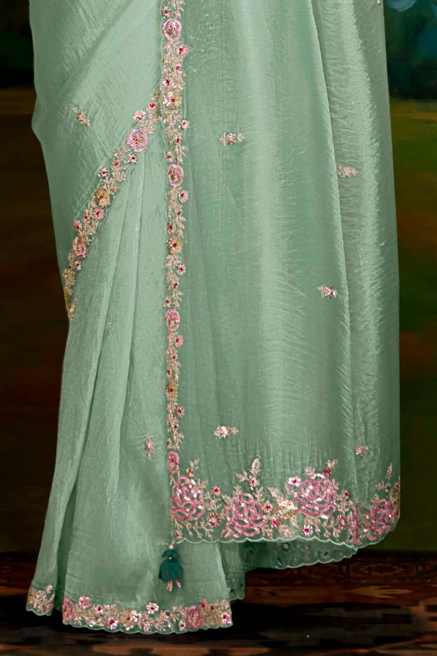 Astonishing Sea-Green Border Work Organza Engagement Wear Saree