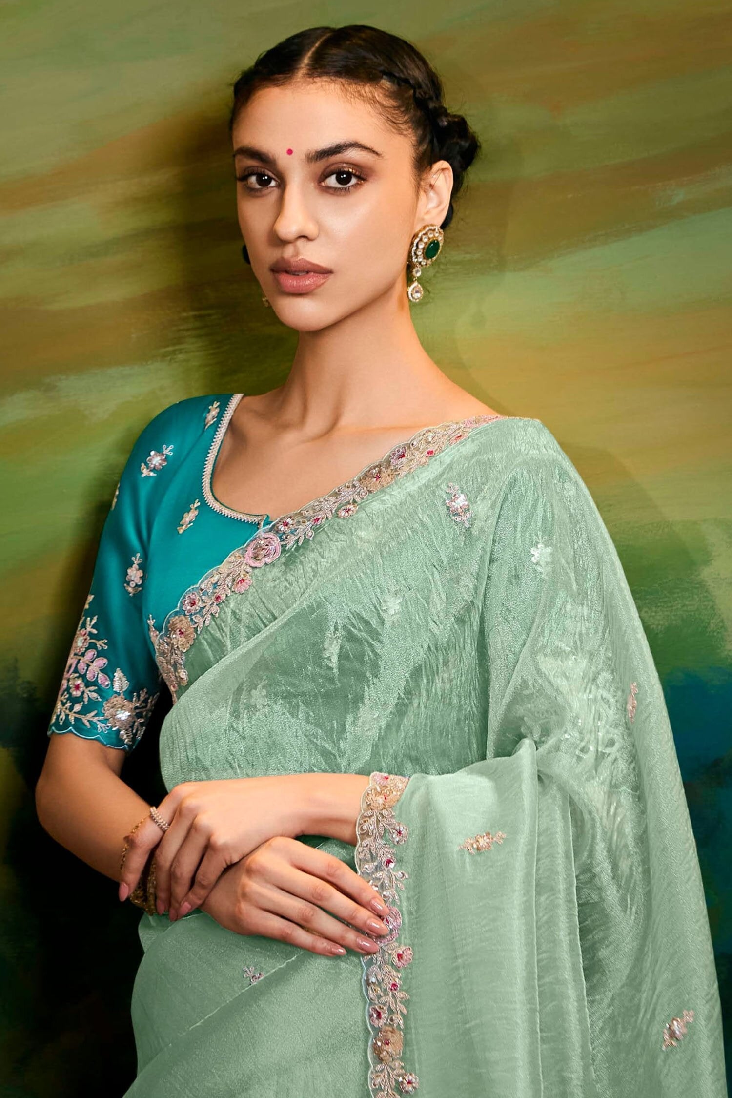 Radiate elegance in this sea-green organza saree, exquisitely adorned with sequin and thread embroidery that adds subtle sparkle. The refined border enhances its charm, making it a perfect choice for weddings, receptions, and engagement events.