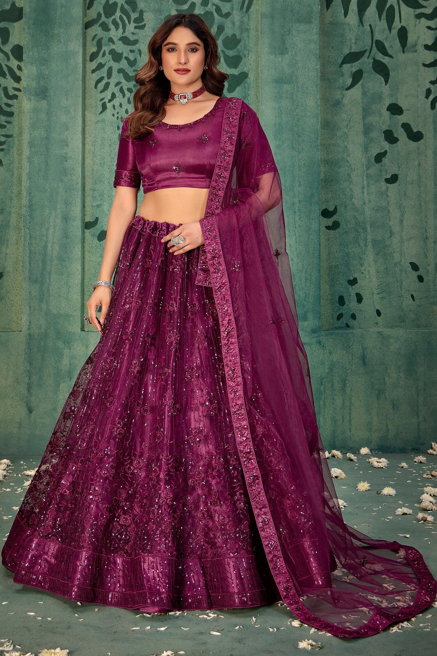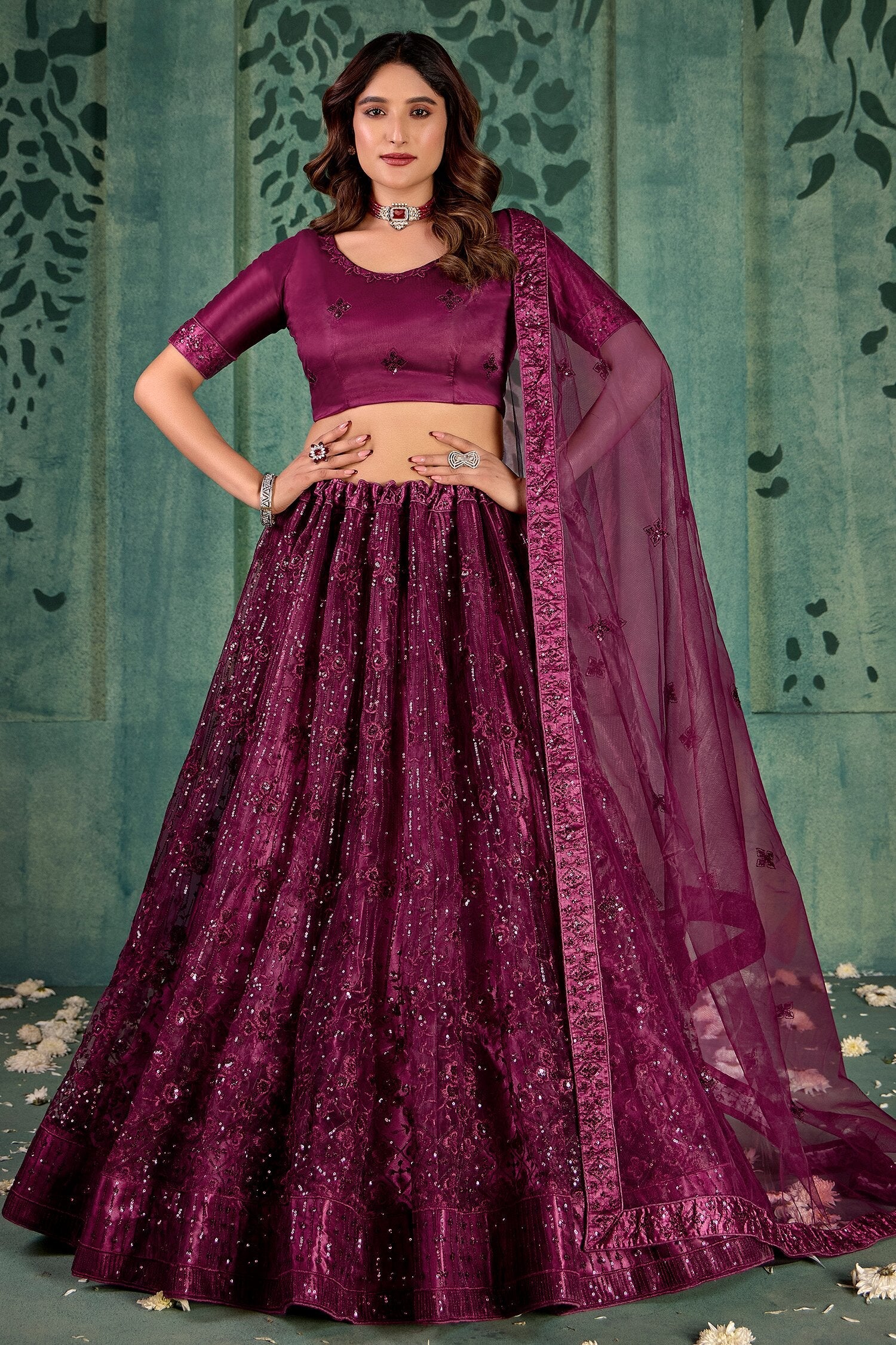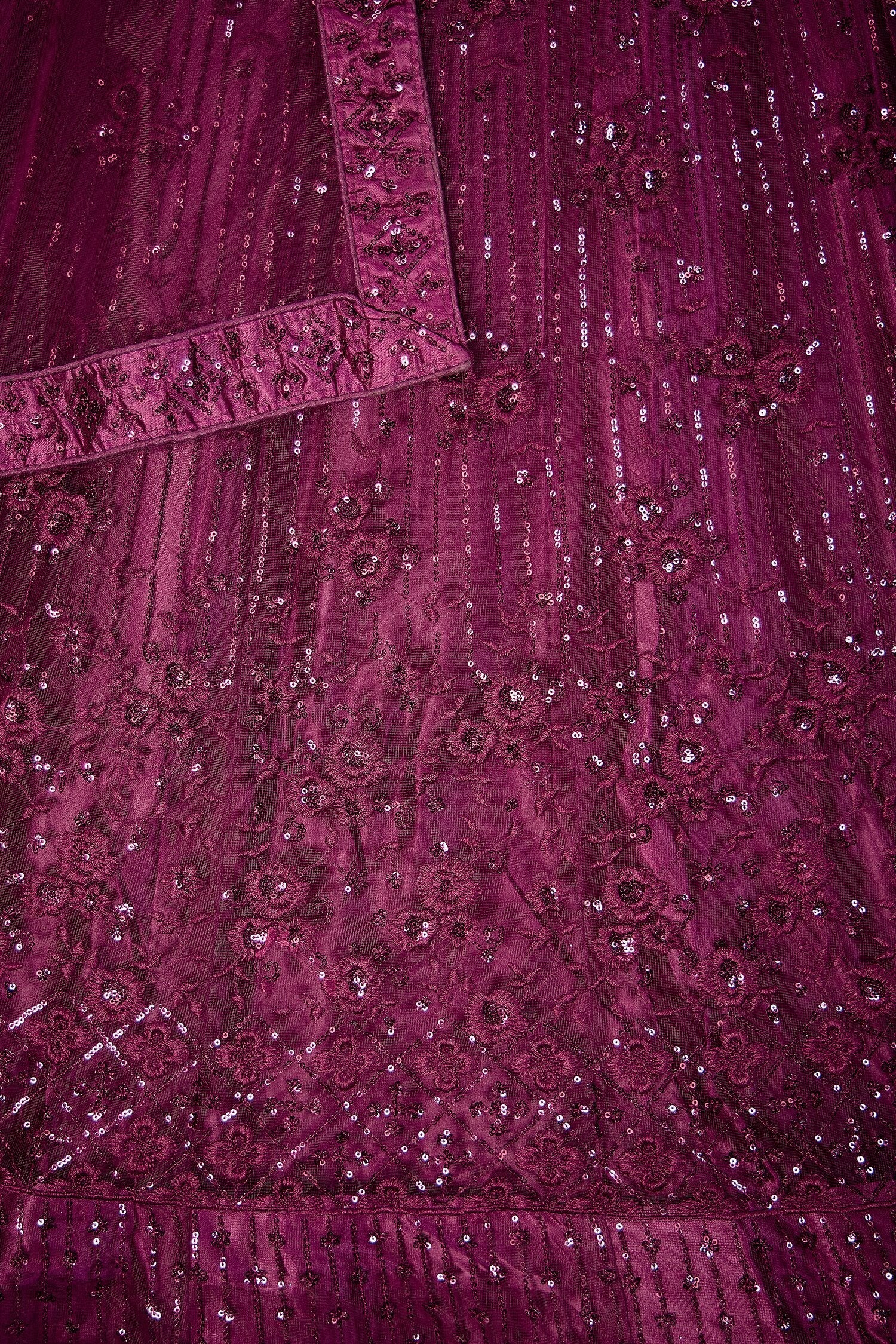 Drape yourself in elegance with this stunning wine-color sequin net lehenga choli set, perfect for weddings and festive occasions. Adorned with intricate sequin and thread embroidery, the semi-stitched lehenga fits up to 42 inches and flaunts a graceful 3.5-meter flair.