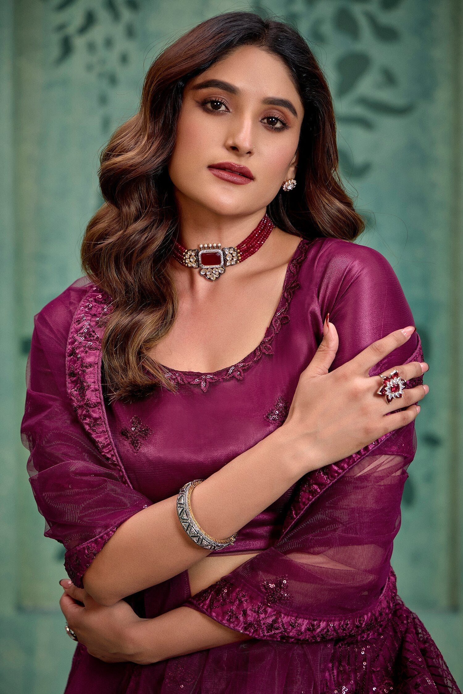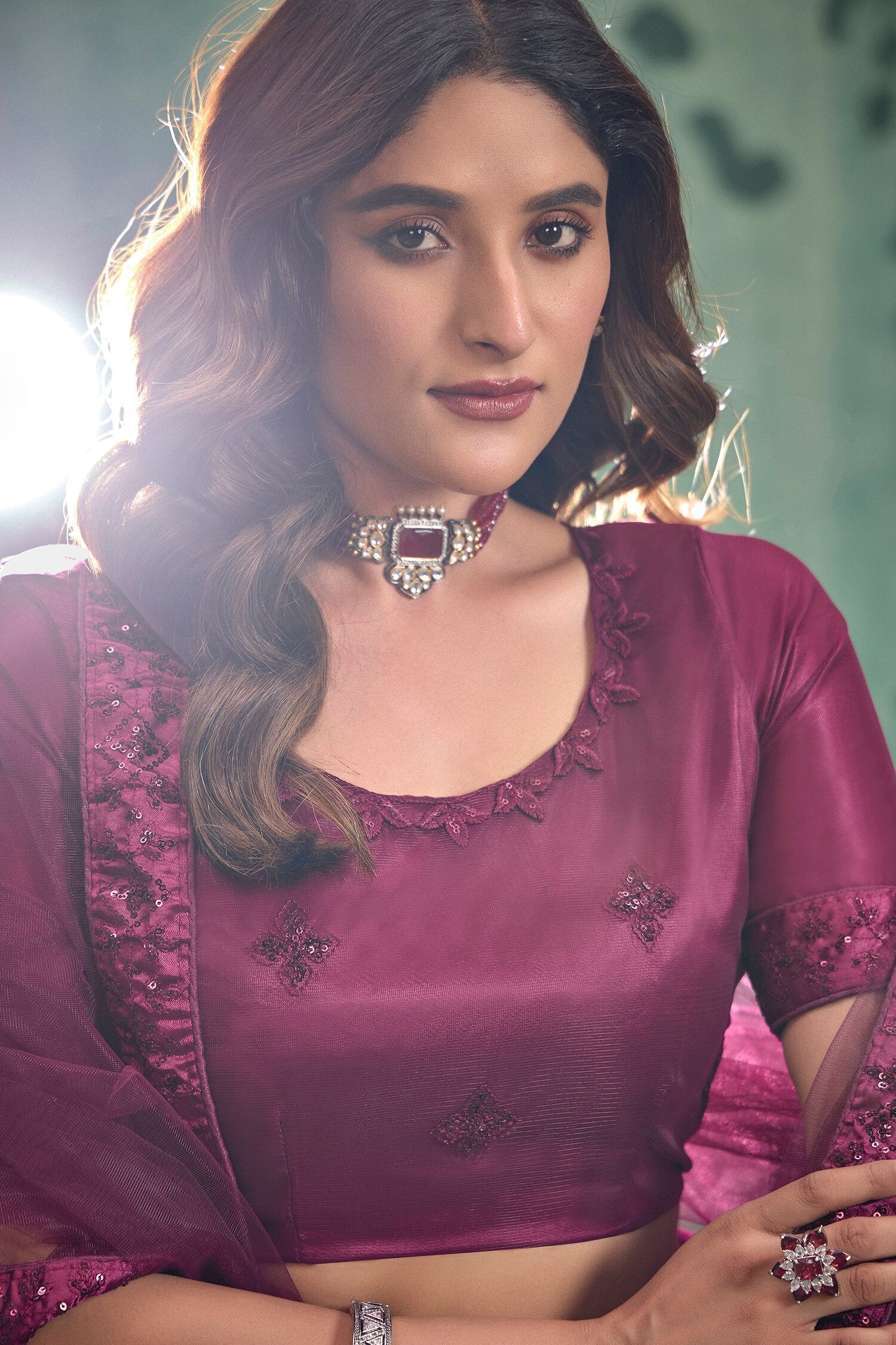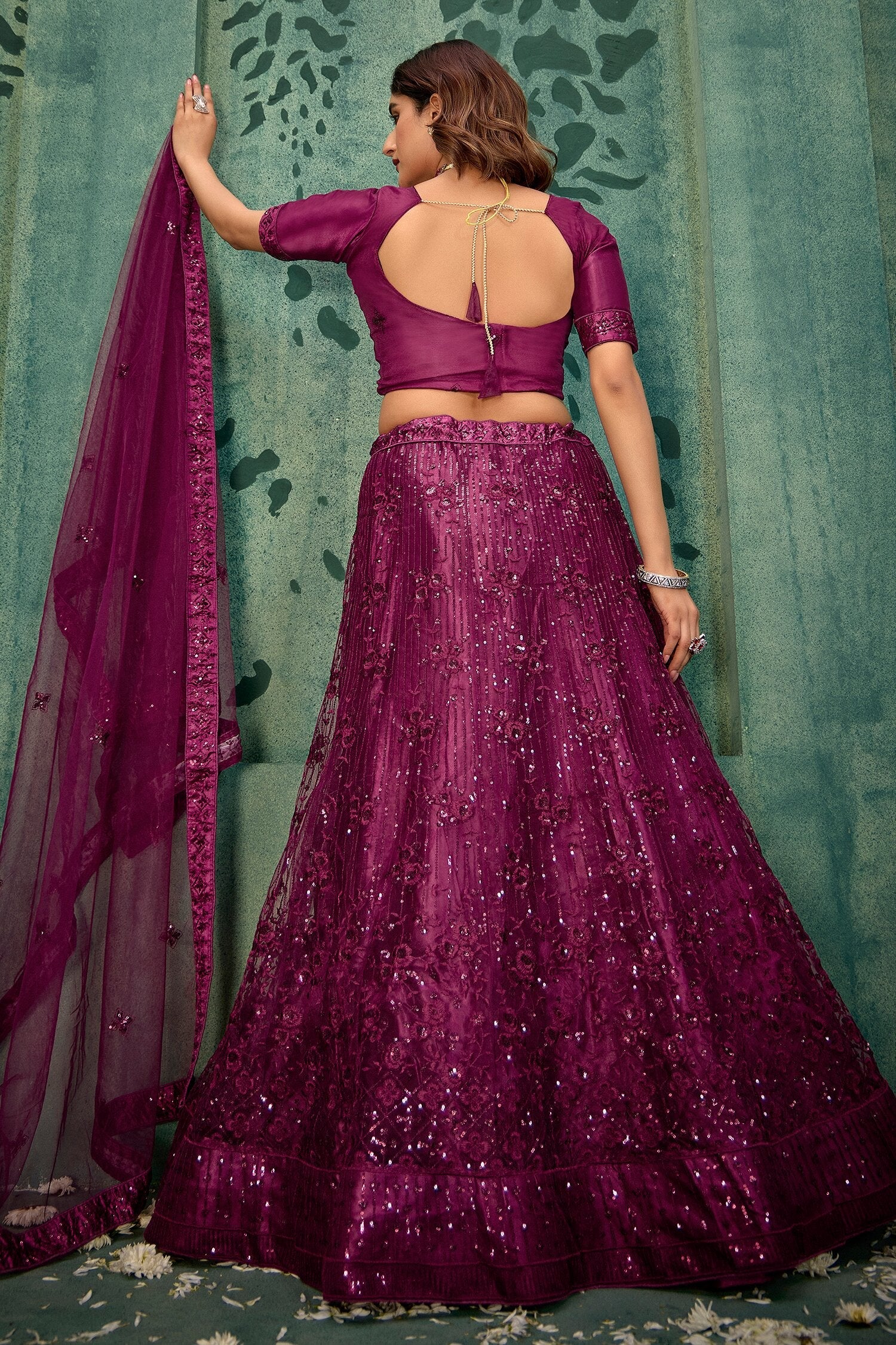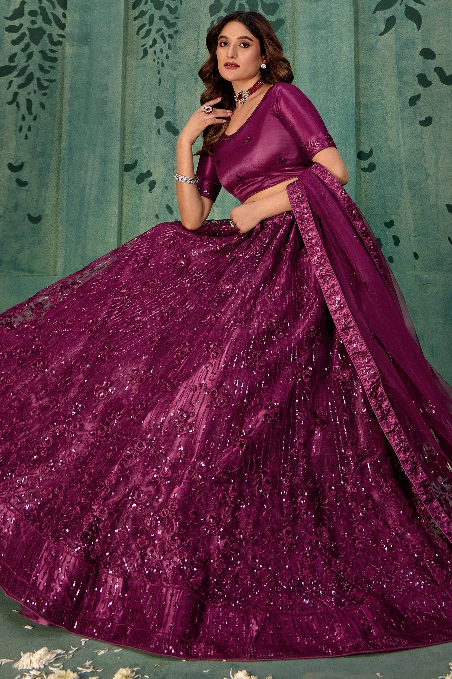 Drape yourself in elegance with this stunning wine-color sequin net lehenga choli set, perfect for weddings and festive occasions. Adorned with intricate sequin and thread embroidery, the semi-stitched lehenga fits up to 42 inches and flaunts a graceful 3.5-meter flair.