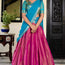 Make a striking impression at your upcoming weddings, events, and festivals with this exquisite rani pink lehenga, beautifully crafted from luxurious kanchipuram fabric. The intricate zari weaving work adorns the lehenga, creating a mesmerizing effect that truly captures the essence of traditional Indian craftsmanship.